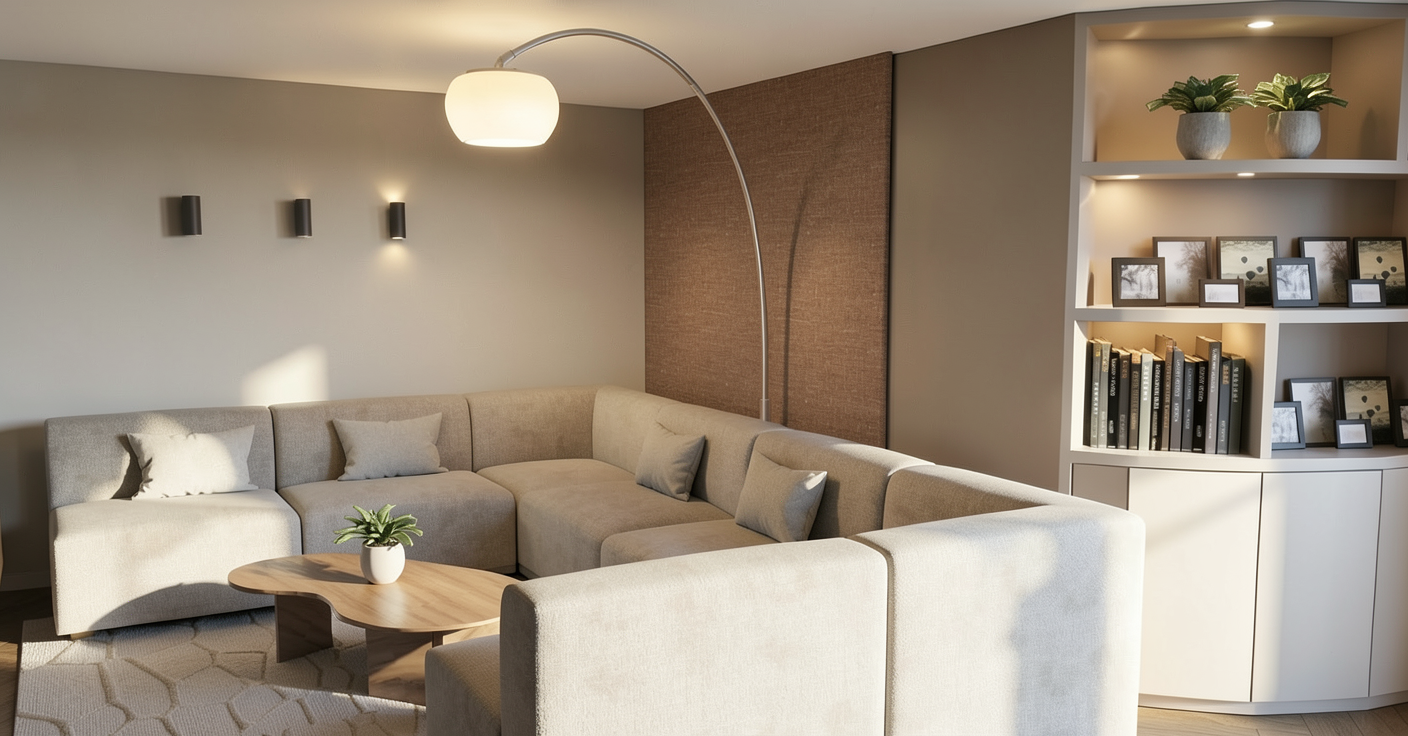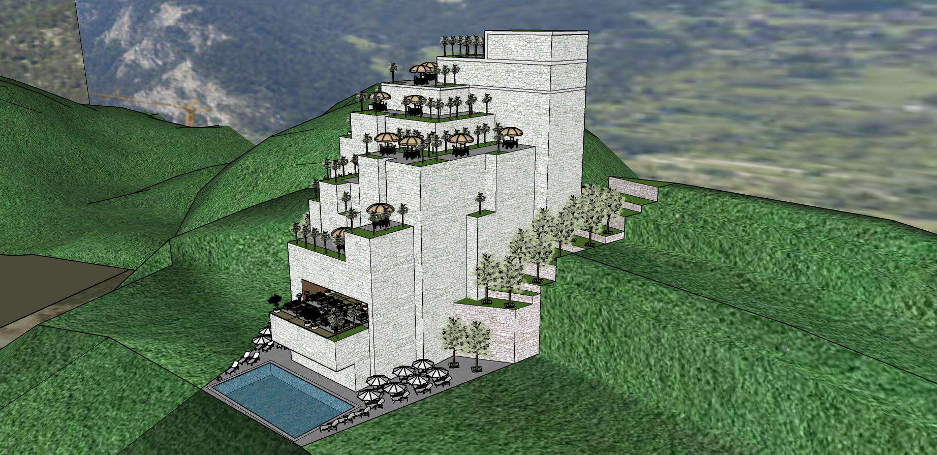 render a stunning architectural resort nestled in lush green mountains featuring cascading terraces with light grey stone walls put large tall and wide glass doors overlooking the terraces and also many windows in all the walls windows and doors have to prevail over the facade each terrace is adorned with vibrant green lawns and elegant parasols in soft beige the surrounding trees are a mix of muted silver and deep green foliage incorporate a luxurious inviting pool at the base with clear blue water the atmosphere exudes tranquility and harmony with nature with soft natural lighting emphasizing the serene setting please fill the surrounding hills with olive trees and some houses make it an elite residential zone