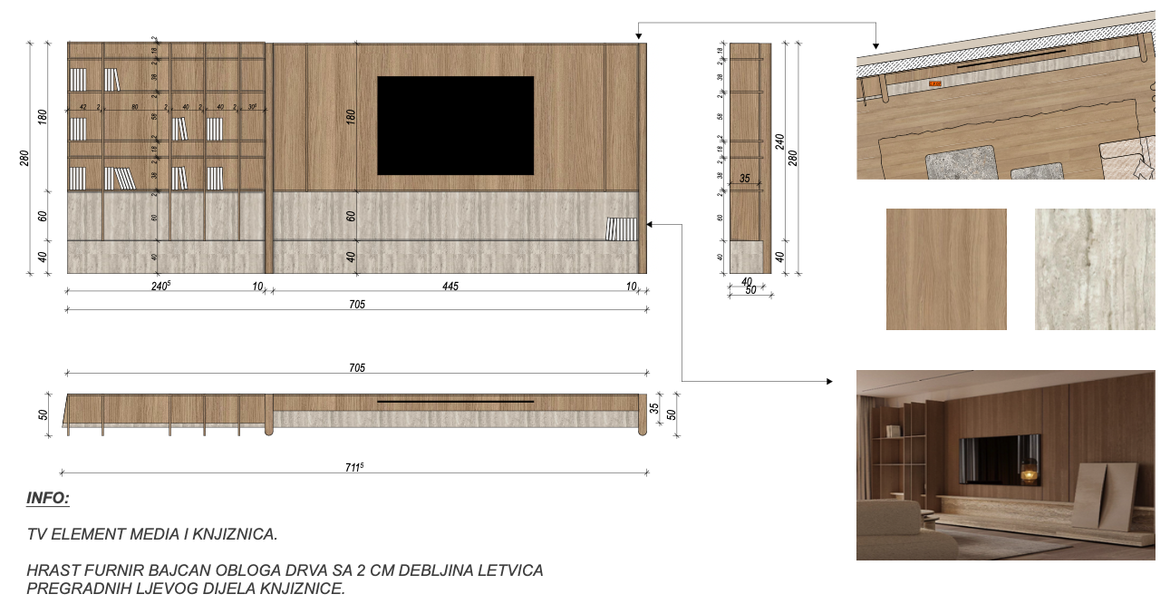 a luxurious and serene living room media wall featuring a travertine stone finish in the botom part and warm natural oak brushed with soft beige tv is samsung frame new generaton with soft matte reflection on the screen the atmosphere is calm and inviting with abundant natural light filtering through the window from the right side window is in aluminium black with beige linen curtain in front of it casting gentle shadows floor is natural oak cashmire color parquet wide 17 cm long 300 cm make it realistic and cast some shadow from the window shelfs should have some vases in black matte with books as well remove the mesurements but keep the design intact make sure section and plan and elevetion are correct