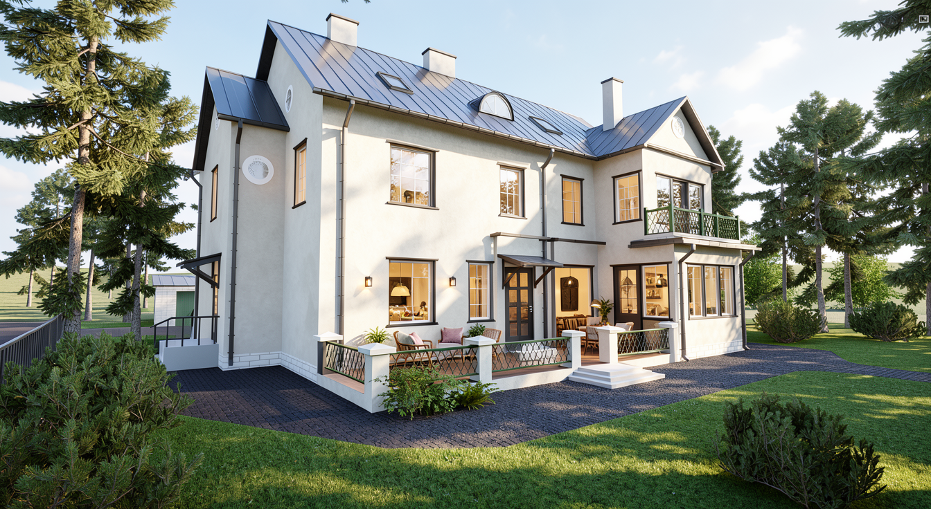 make phoratlistic add some furniture and lights inside the house day picture put curbs on the sidewalk