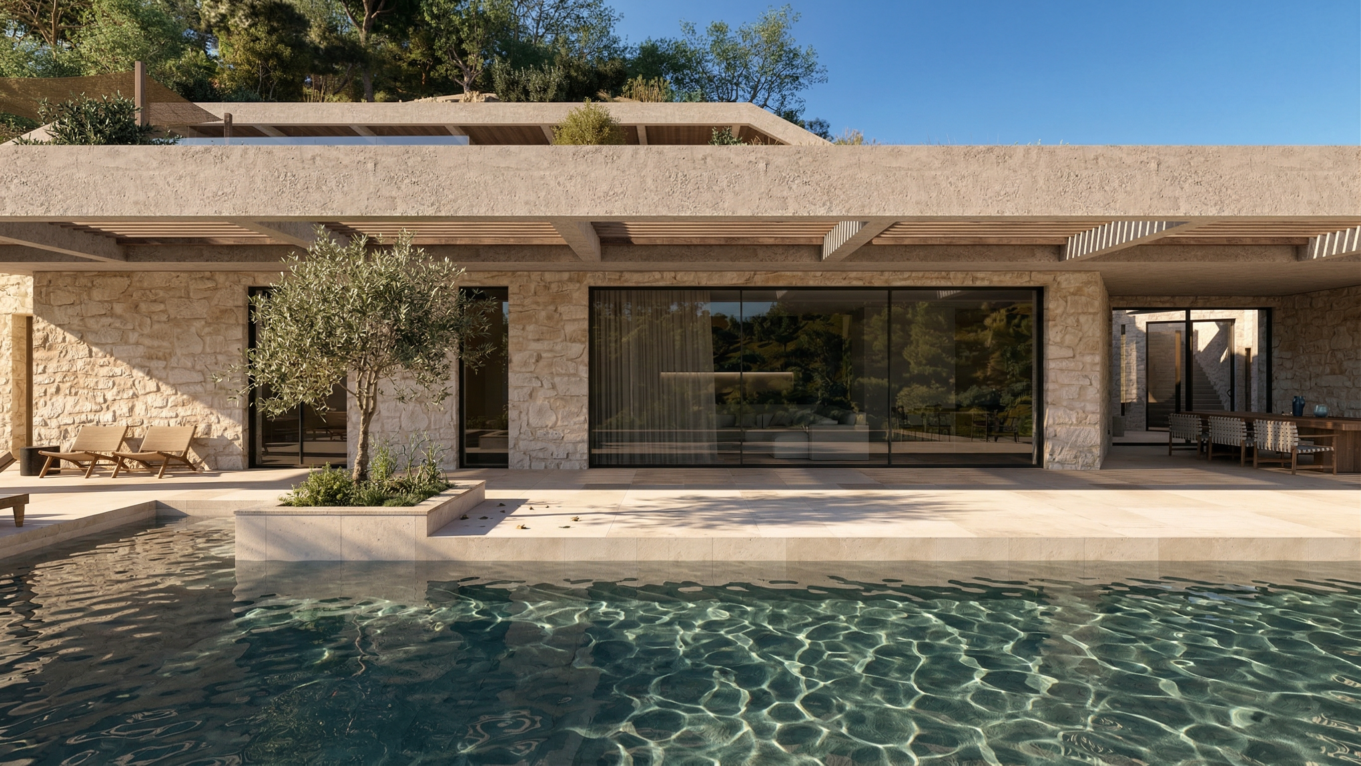 architectural section drawing preserve original 2d linework exactly clean black line drawing maintain all dimensions numbers and text unchanged no distortion of annotations no modification of labels add subtle artistic rendering soft atmospheric collage style minimal watercolor textures light concrete and plaster textures inside volumes insert human silhouettes in correct scale based on architectural dimensions average height 1 70m black minimal figures no silhouette style add mediterranean natural landscape in background soft depth trees like pine and olive trees muted earthy tones green beige terracotta foggy atmosphere architectural clarity do not overpaint lines keep structure readable soft shadows calm mood minimal aesthetic architectural visualization style collage rendering similar to competition board presentation high resolution balanced composition