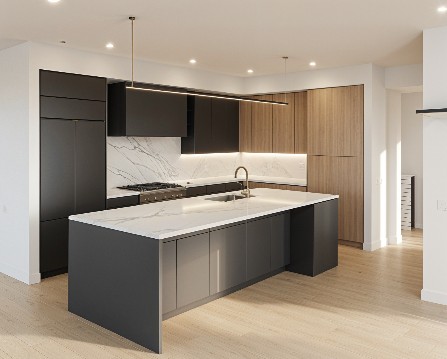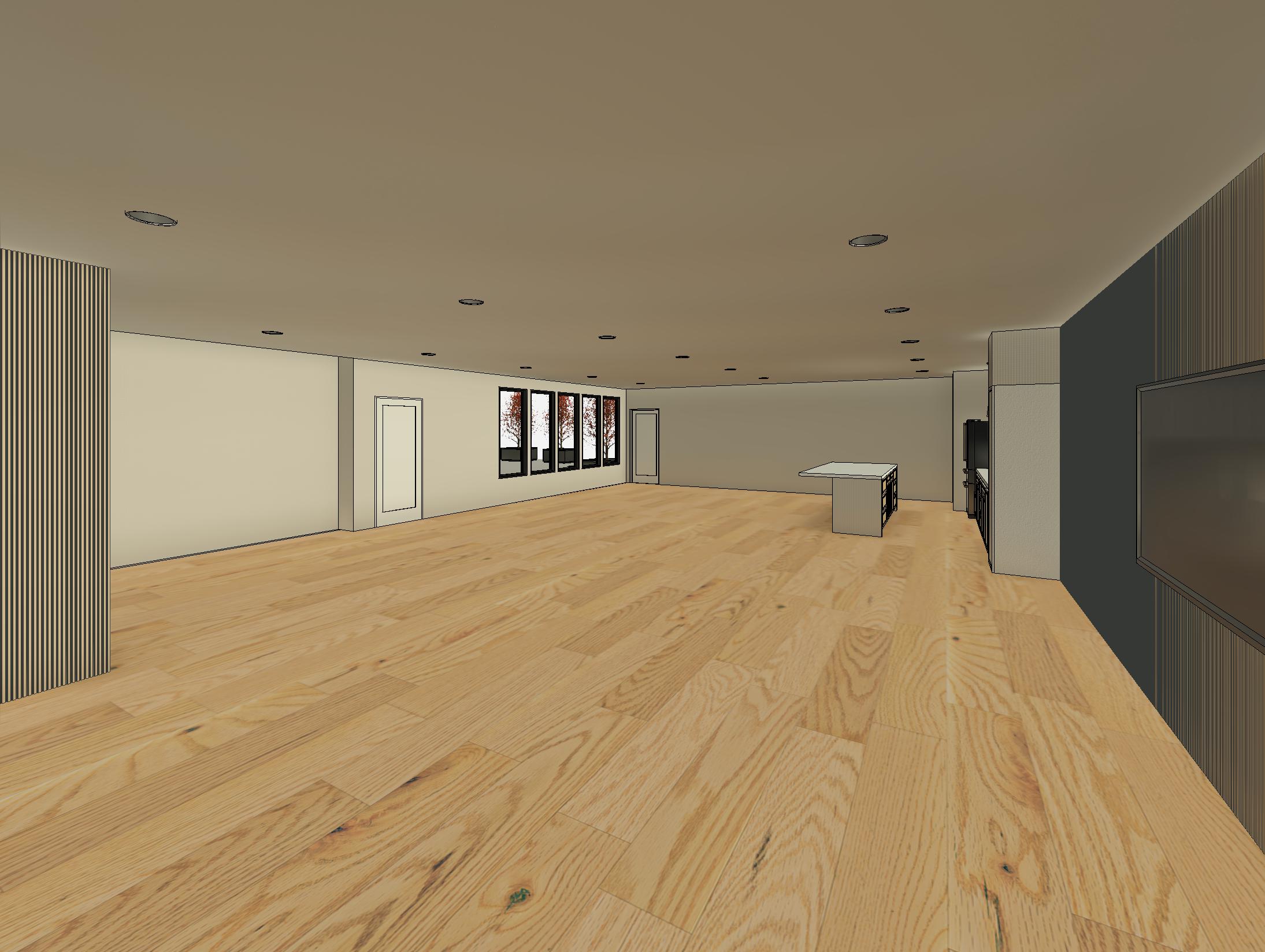 a modern open concept interior design with a warm and inviting atmosphere the wooden floor is oak with a natural honey finish walls are painted in sherwin williams colonnade gray hex value c6c0b6 complemented by white baseboards and door frames the ceiling is a clean bright white with recessed lighting providing a soft glow large windows line one wall allowing ample natural light to flood the space a sleek minimal kitchen island in a matte white cabinets is the focal point the billiard table features rich dark wood and deep green felt the overall ambiance is cozy yet elegant with a harmonious blend of neutral tones