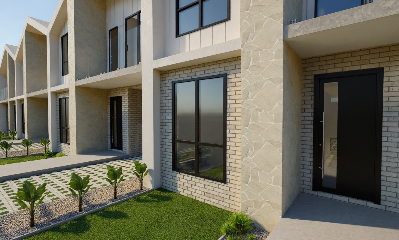 use wood stone concrete material coziness and greenery set in the evening with soft gentle sunlight make it a community center make roofs curvy concave architecture
