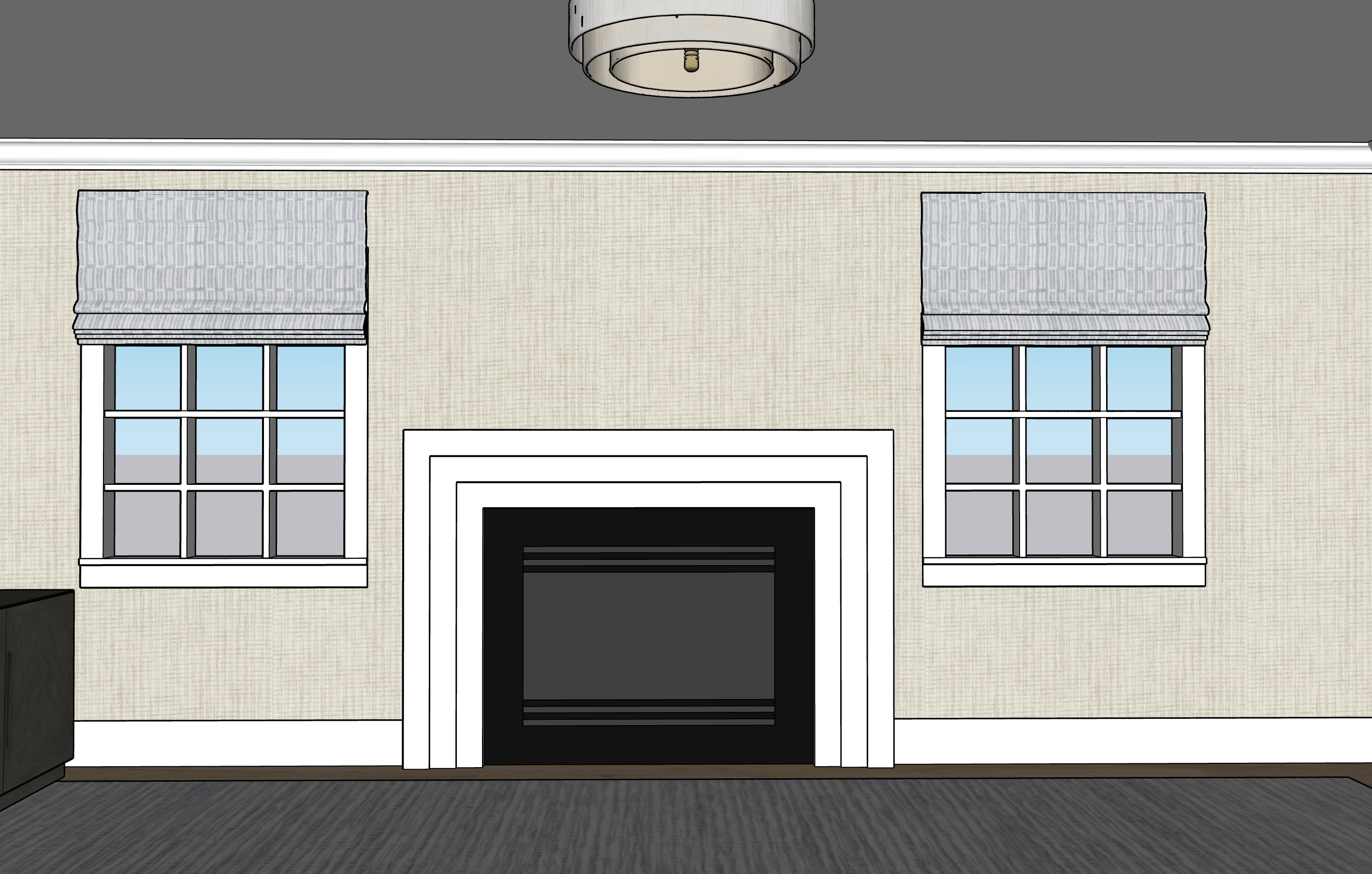 the uploaded image is a finished sketchup interior scene with final materials already applied preserve the camera angle room layout and furniture placement exactly as shown all materials must remain unchanged including the fabric the upholstery the rug the fireplace surround the mantel and the wood flooring do not reinterpret fabrics colors or textures enhance the image by adding realistic lighting shadows and material depth only to create a photorealistic architectural rendering strict preservation keep all fabrics patterns colors and materials exactly as shown material fidelity required