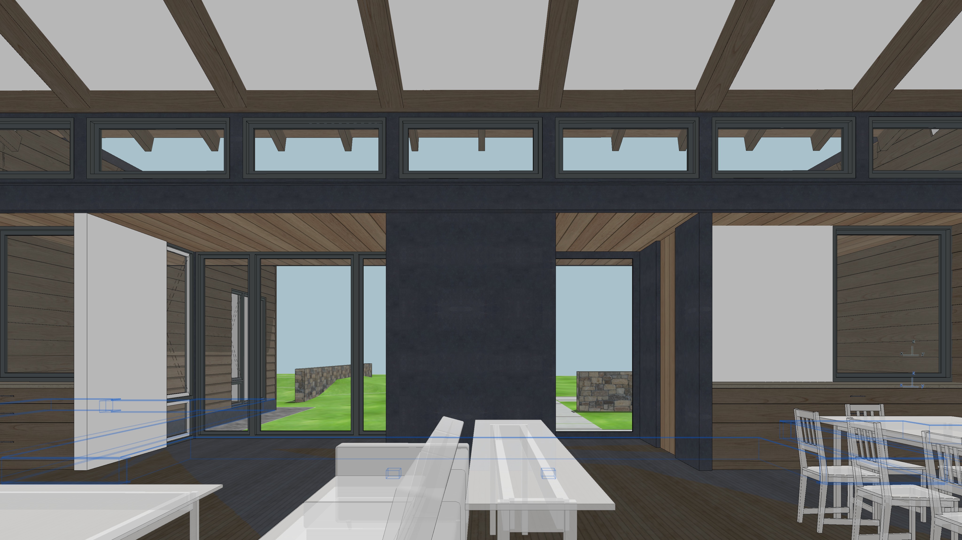 white oak table and chairs fabric couch wild mountain grasses outside mountains close in the background