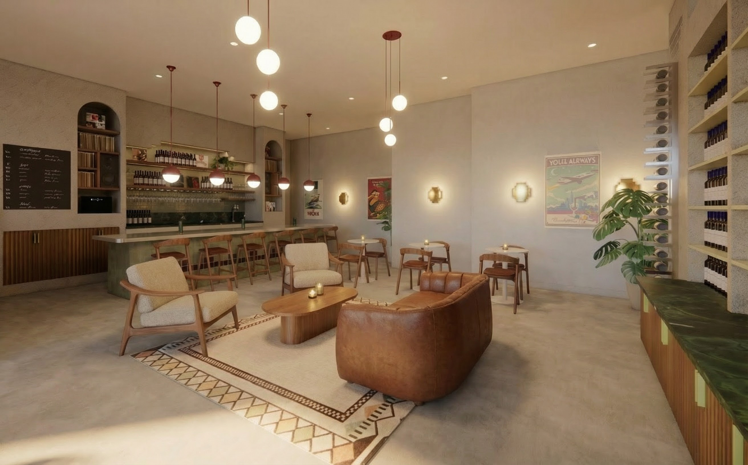 maintain everything exactly the same maintain all geometry colors furniture placement lighting camera angle and textures only add a vintage vinyl record player with two turntables and a mixer that is elegantly inset into the bar on the left side it is completely flush with the bar counter so the image only shows the flat top of the record player with the vinyl records and the mixer buttons the bottom of the record player is hidden under the bar counter on the left side of the bar on the bottom shelf of the archway replace the black box with a vintage mcintosh tube amp