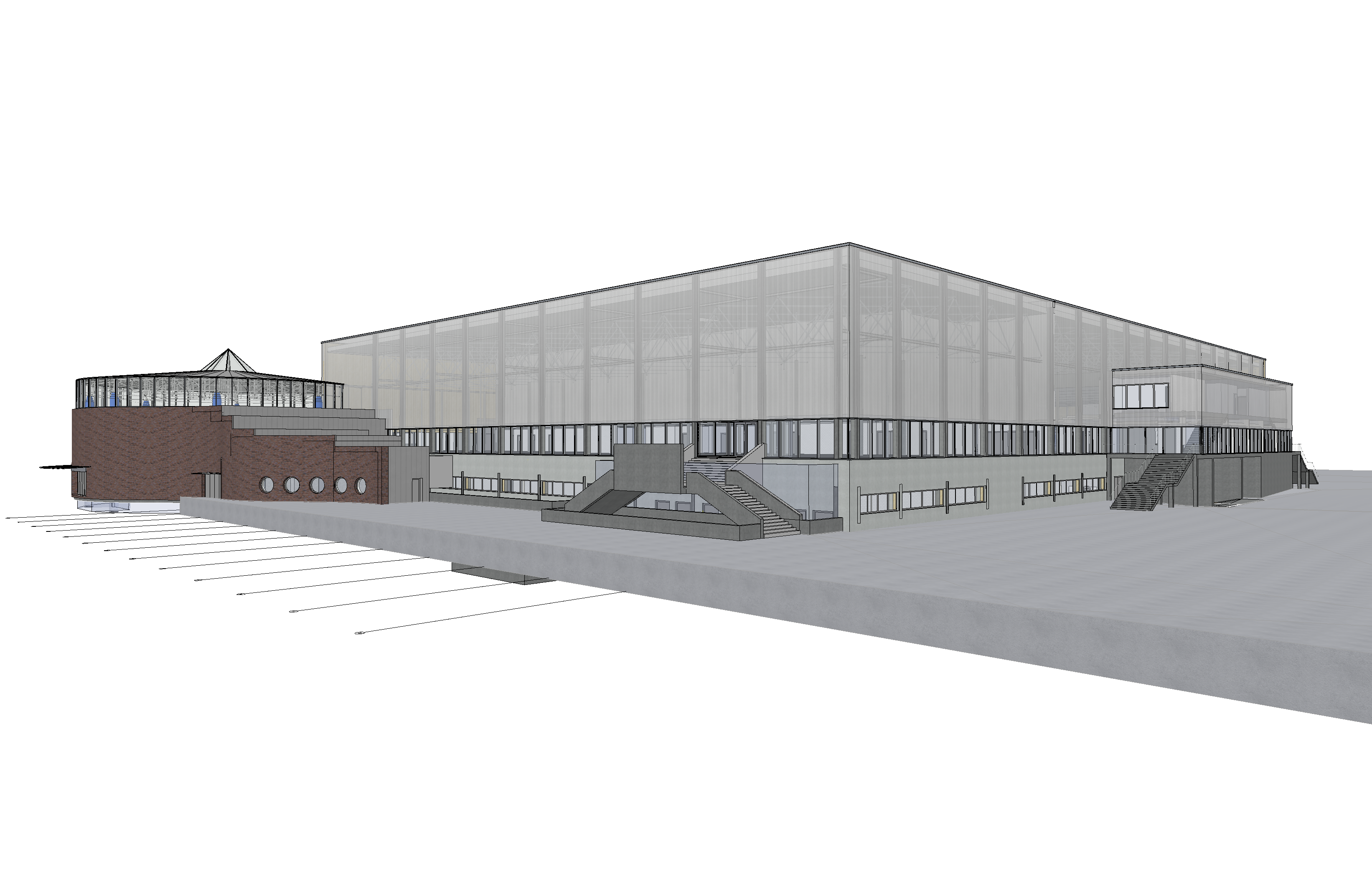 render a modern architectural structure with a sleek minimalistic design the building features a large rectangular form with a circular extension use deep brick red for the circular building enhancing its texture the main structure is wrapped in translucent glass panels with a subtle steel gray frame reflecting ambient light add dark gray for the staircase and detailing around windows creating contrast the ground is a smooth concrete texture in a light gray shade set under a dynamic sky with soft diffused sunlight casting gentle shadows for an atmospheric refined look