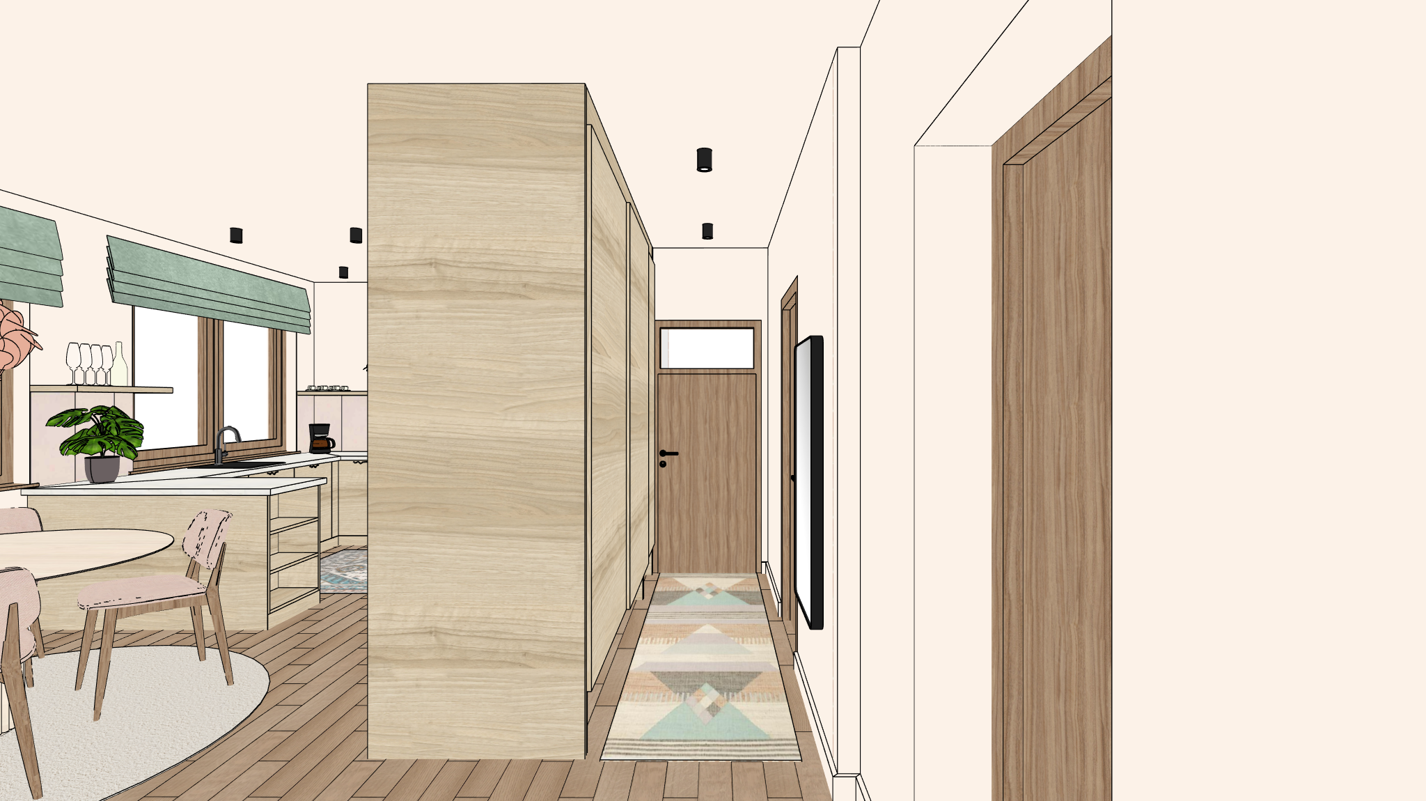 entryway with cream colored walls wood plank floors in a soft color on the floor there is a pink cream mint colored rug the front door is in front of us above there is a transom warm daylight comes in through the transom on the right wall there is a door and a mirror with black frame the huge wardrobe in the middle of the picture is light walnut it has sliding door facing the entryway behind the wardrobe is the kitchen with a big window mint roman shades and pale pink tiles part if the round dining table is visible on the left there is one chair with blush pink upholstered seat