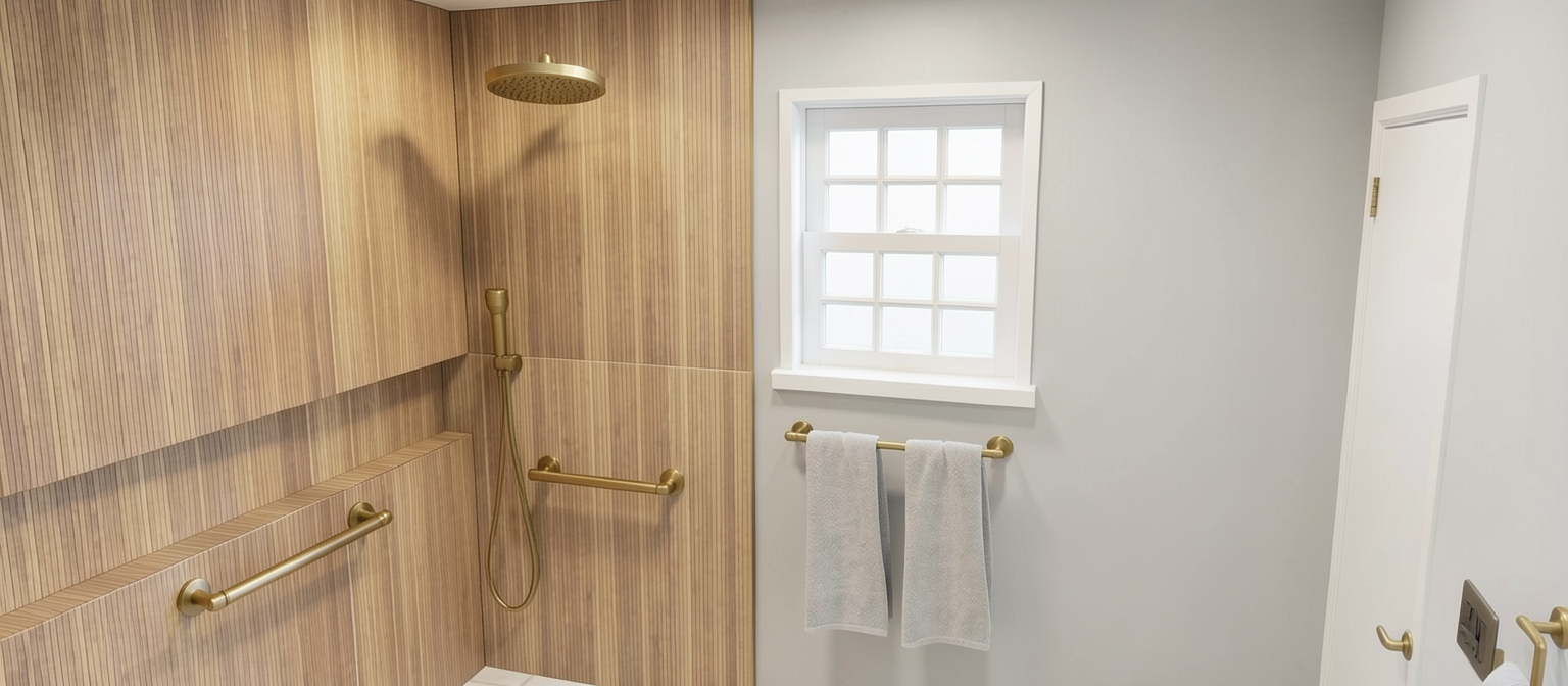 clean modern architectural exterior rendered in cinematic bright golden hour lighting french country architectural style concrete driveway leading up to the house lined with beautiful hedges and well manicured greenery and plants white siding with horizontal warm cedar accents black overhang and sides around the front door black standing seam metal roof visible prominent trees landscape in the background natural wood textures high fidelity photorealistic visualization crisp shadow falloff refined facade geometry richly detailed grain patterns soft atmospheric depth premium architectural photography mood ultra clean composition and materials
