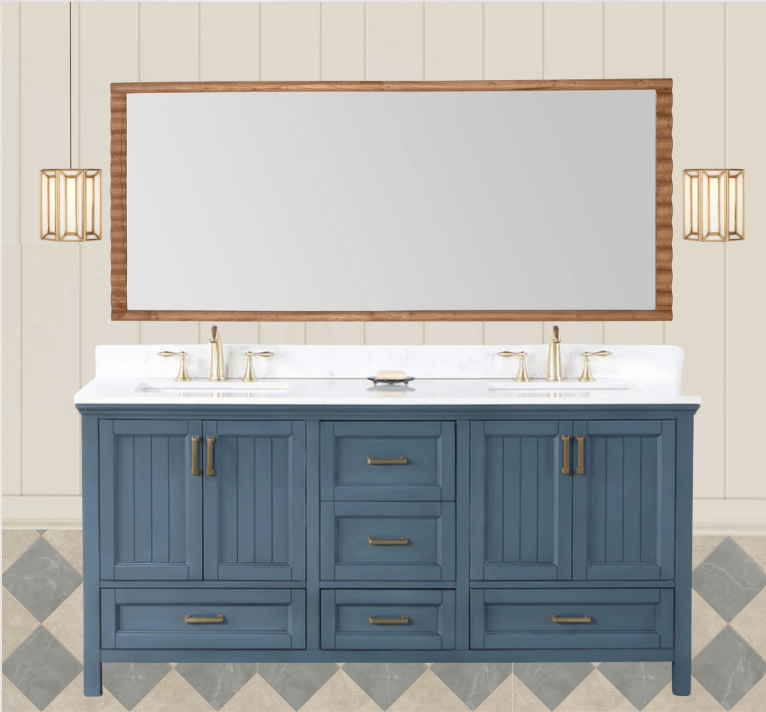 a bathroom vanity scene featuring an elegant navy blue cabinet with brass handles adorned with a sleek white marble countertop a large framed mirror with a warm wooden border sits above the vanity on either side of the mirror two stylish gold pendant lights hang against a soft beige panel wall the floor displays a pattern of large square tiles in alternating shades of gray and beige creating a sophisticated atmosphere the lighting is warm and inviting enhancing the luxurious feel of the space please remove the dimensions from the mirror the pendant lighting is installed from the ceiling not the wall and is 12 h x 5 5 w