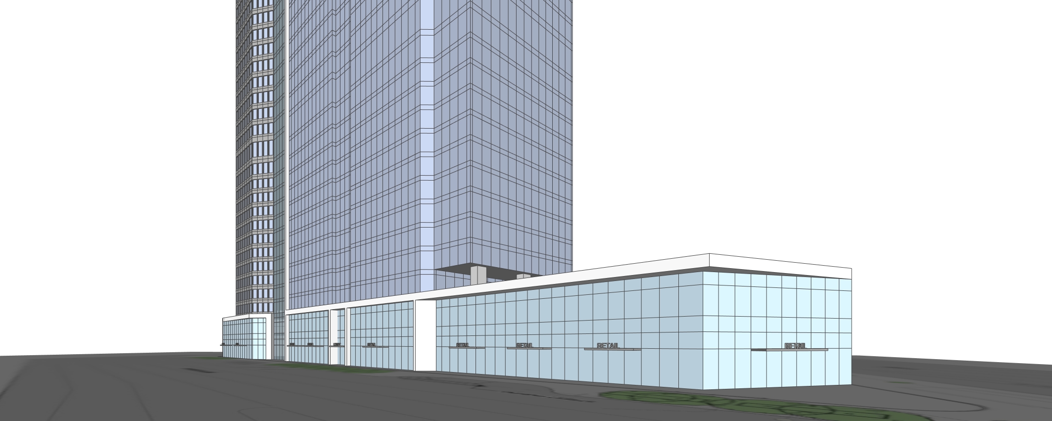 white background do not change massing add retail at ground level remove cars