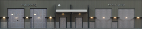 modernist perspective shot take the image of this 100 foot wide and 20 foot high building with 14 foot high garage doors and and generate a new image that can be used for promotional material add a blue sky and a street in front of the building and 20 wide chain linked fence on wither side of the building to represent an area for outdoor storage architecture