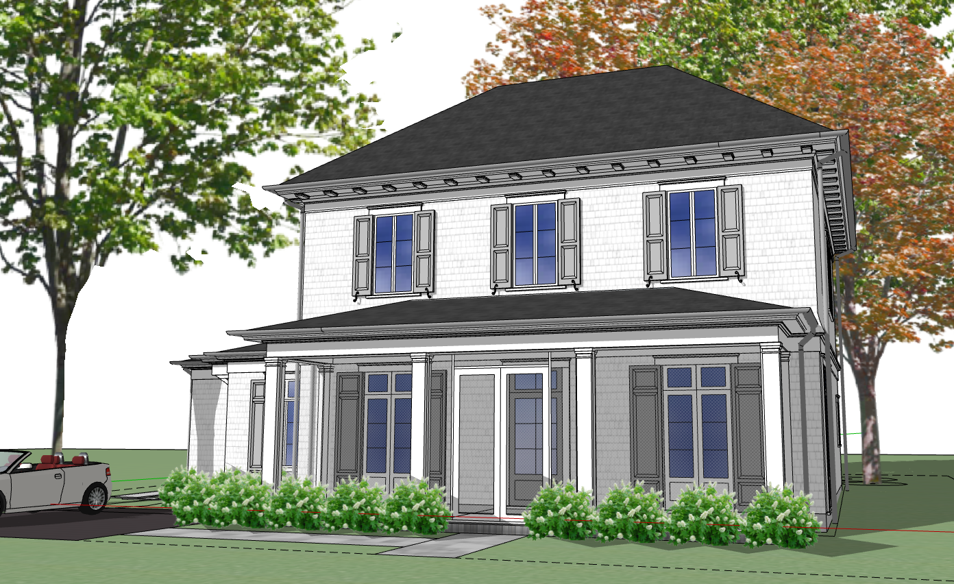 all the siding on the house is painted white cedar shakes add lots of trees to the background nice and happy lighting during the summer