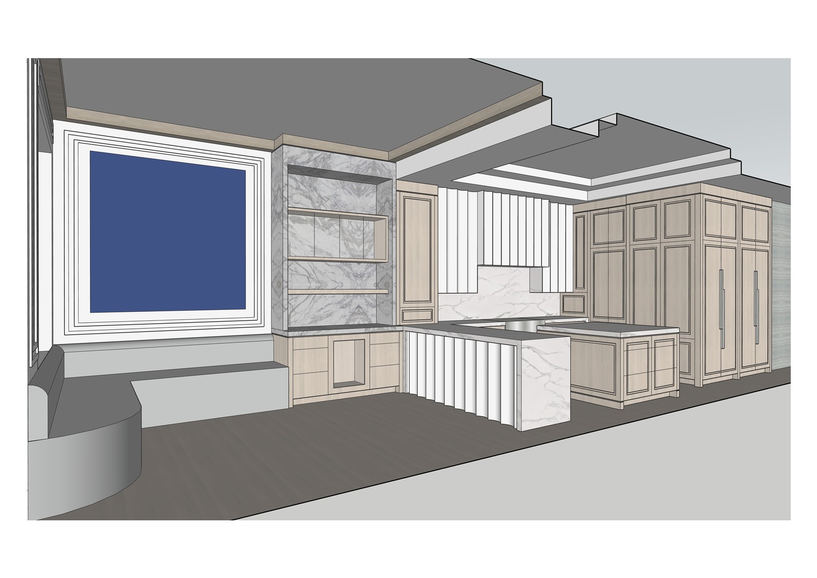 transform the provided elevation into a hyper realistic interior photograph that is indistinguishable from a real professionally shot interior design photograph this must read as a real space captured by a camera not a rendering not a visualization not architectural cg not concept art and not an illustration geometry lock non negotiable preserve the exact original geometry layout proportions ceiling details wall depths panel divisions openings doors cabinetry locations millwork dimensions built ins and circulation paths with zero architectural changes nothing may move scale simplify or be reinterpreted geometry must remain absolutely unchanged camera derivation critical derive the camera position height angle and framing strictly from the uploaded elevation eye level interior photography centered or naturally balanced composition 24 35mm interior lens feel no dramatic angles no stylized framing do not reuse or approximate camera framing from any previous image remove all drawing artifacts completely remove all linework cad edges drafting outlines diagrammatic shapes sketch artifacts nothing may appear outlined flat schematic or illustrative the elevation must be visually reinterpreted as a finished real interior photograph material realism rules wood if present smooth solid plank material extremely subtle restrained grain matte or soft satin finish only no graphic patterns no decorative striping no visual noise wood must absorb light gently never glossy or sharp fabric upholstery if present soft compression subtle seams gentle shadowing natural fabric texture no flat color blocks stone slabs if present light natural veining soft organic variation low contrast no symmetry no bold or busy patterns stone must feel heavy and grounded walls fine surface texture slight tonal variation never flat paint edge construction realism all edges corners joints and transitions must be softly broken and physically realistic no razor sharp corners no cgi perfect edges slight construction tolerances only everything must read as fabricated installed and dimensional lighting photographic behavior lighting must behave like real high end interior photography natural daylight only unless otherwise specified realistic light bounce gentle shadow falloff uneven exposure distribution subtle brightness variation across surfaces avoid studio lighting uniform illumination over clean exposure global illumination look slight softness is preferred over sharpness camera image imperfections very important introduce subtle photographic characteristics gentle lens softness micro exposure variation natural contrast roll off mild atmospheric depth primary plane sharp background slightly softer the image must feel captured not generated absolute constraints no creative interpretation no stylization no exaggeration no added or removed elements any deviation from the original elevation geometry or intent is unacceptable negative prompt always include architectural rendering 3d visualization cgi unreal engine octane vray sketchup look flat textures graphic lines outlined edges over sharpened studio lighting concept art illustration ai look plastic materials glossy wood high contrast grain perfect symmetry keep design as shown in the picture keep the design as it is in image light cabinets are white and brown cabinets are white oak keep design in the image as it is including materials of the image please keep the design and materials as they are in the image keep the occuracy of the cabinetry panels 100 as image do not change design