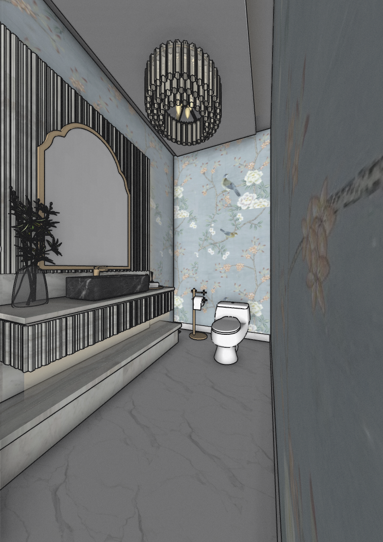 carrara marble in ridded vanity and blue silk painted wallpaper