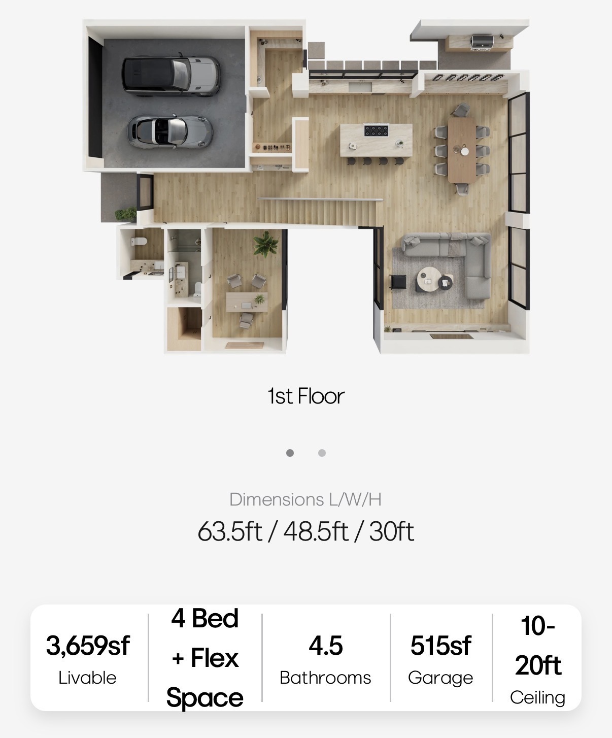 convert this floor plan into a realistic isometric 3d view of a full house show the space from an elevated angle with furniture walls and details visible a detailed modern architectural rendering of a spacious first floor layout with ambient lighting the scene is set in a contemporary style with a warm inviting atmosphere the living room features a plush white sectional couch and round coffee table on a soft beige carpet accented by large black framed windows the open kitchen includes sleek oak cabinets a central island with black countertops and a stainless steel stovetop adjacent the dining area showcases a light wood table surrounded by six black upholstered chairs hardwood floors in a natural oak finish span the main space contrasting with the two car garage s muted gray concrete floor decorative plants add a touch of greenery and recessed lights cast a soft glow enhancing the cozy and elegant ambiance use the same furniture as shows on the plan do not change the orientation of the floorplan