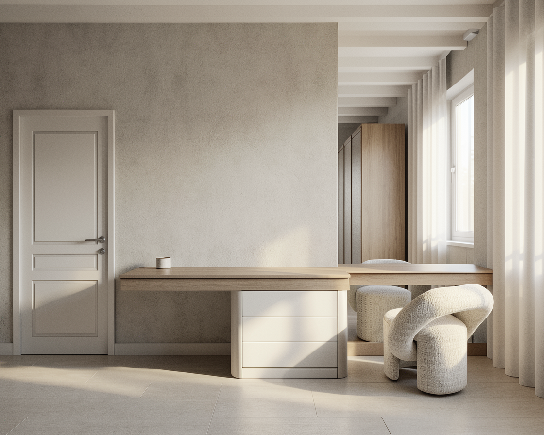 a photorealistic architectural rendering adjustment where the tasting table stone is modified to have a matte finish with a raw natural texture typical of traditional wine cellars the brown grey stone appears slightly rough and mineral with a non polished surface that absorbs light rather than reflecting it reinforcing the authentic cellar atmosphere the table keeps the exact same shape size and position in the room only the material finish is changed to a matte raw stone appearance additionally the ceiling lighting is simplified so that only two discreet recessed ceiling spotlights remain centered in the middle of the room providing soft warm illumination while maintaining the calm atmospheric lighting of the wine cellar