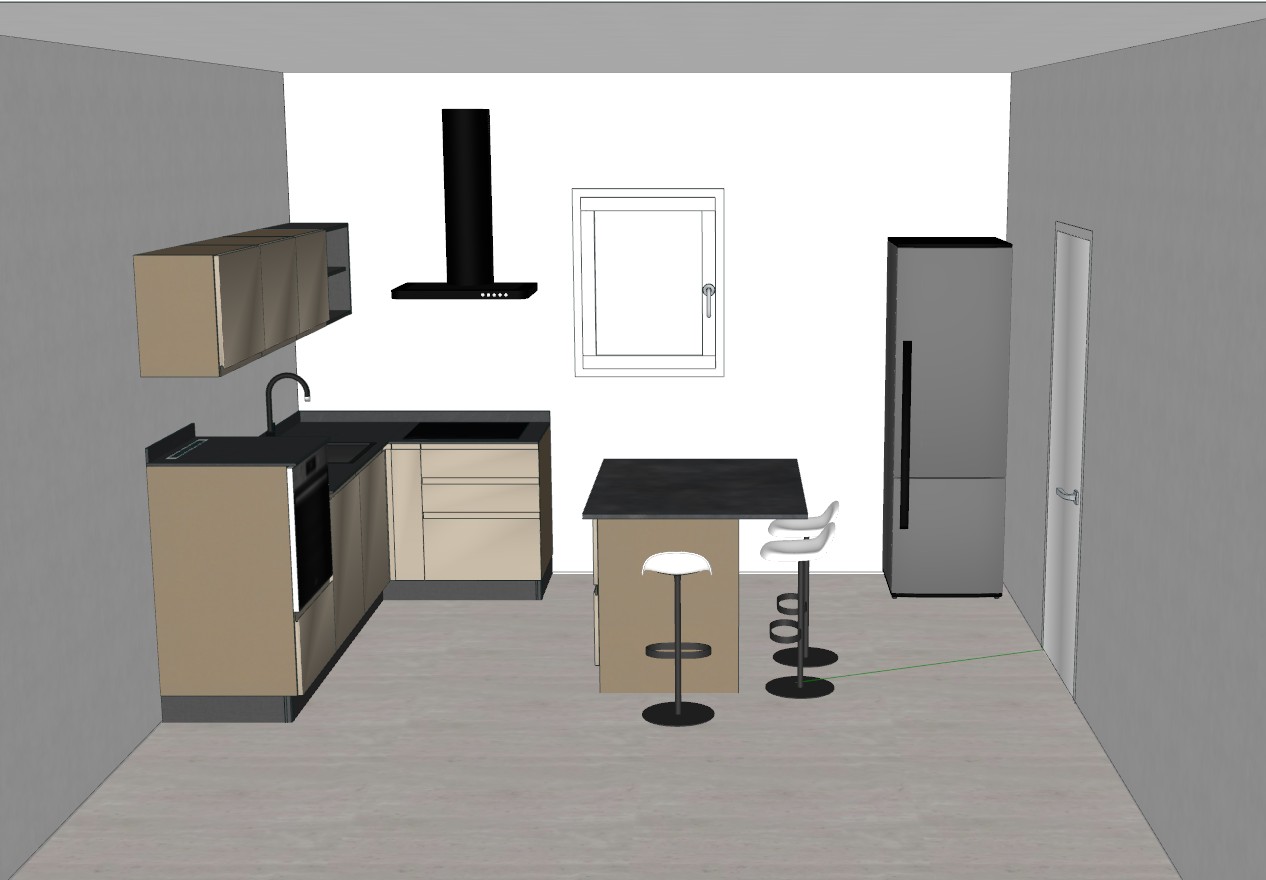render fotorealistico colore cucina fango con piano di lavoro antracite cappa e frigorifero neri pavimento travertino aggiungo travi legno noce a sottiffitto ambiente con atmosfera accogliente luce naturale