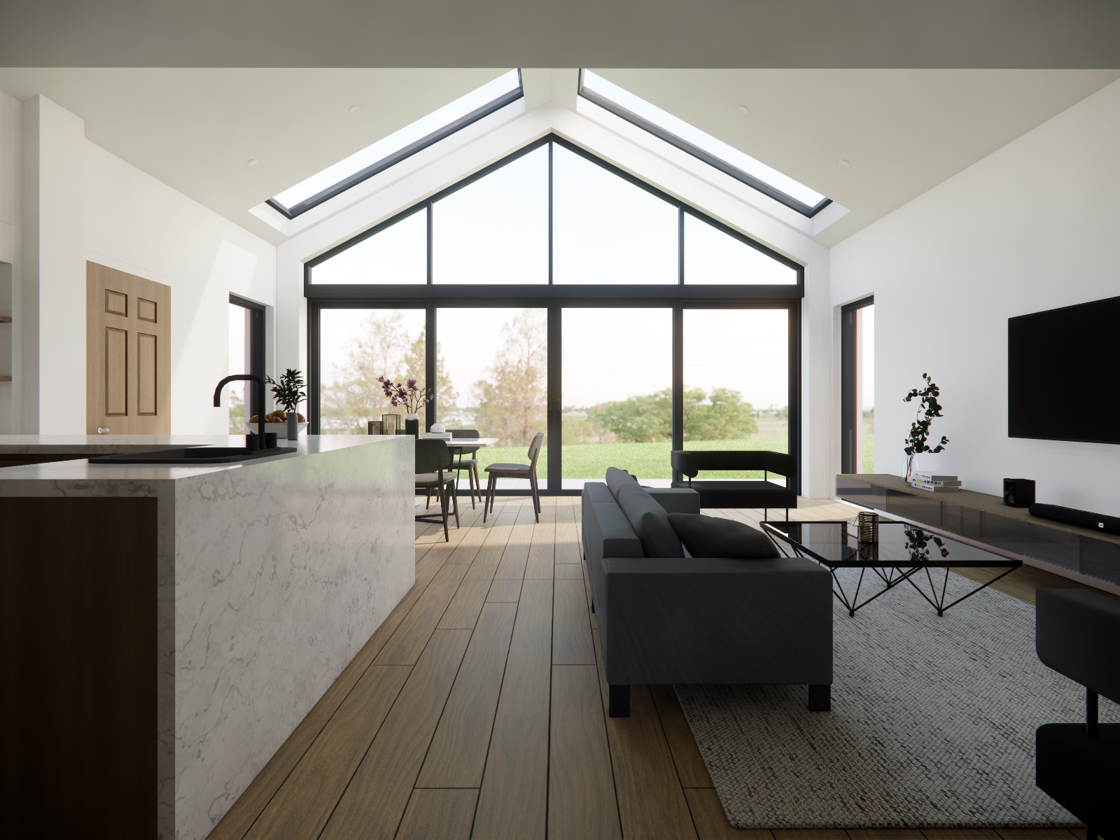 create a realistic render of an interior from the screenshot this is a rear extension of a uk home keep the same layout and materials make the render look bright natural and realistic as if photographed during daytime