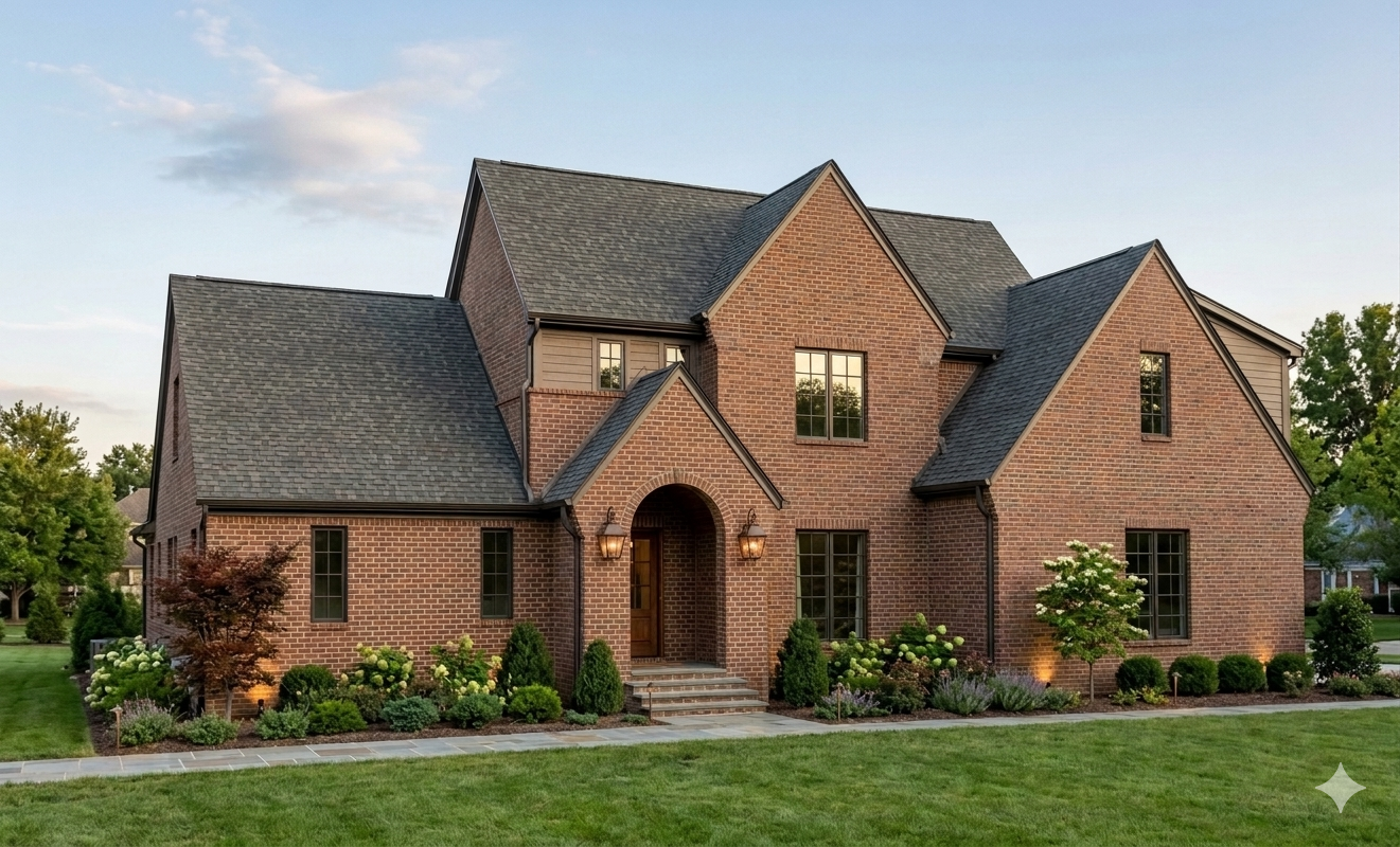 a charming two story brick house with a classic design the brick is a warm red brown contrasted by dark gray shingle roofing the windows are large and framed reflecting the surrounding lush greenery the atmosphere is serene and welcoming with well maintained landscaping green hedges and flowering plants surround the house their colors a vibrant mix of deep green and pops of white from blooming flowers the sky is a gentle gradient of light blue indicating early evening casting soft shadows on the scene lanterns at the entrance exude a warm golden glow enhancing the cozy inviting atmosphere in the woods