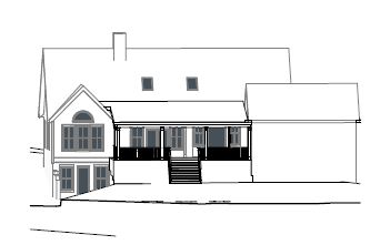 highly detailed pencil architectural rendering of a house with a shingle roof and covered front porch dark grey lap siding suggested through fine parallel line shading traditional architectural studio drawing style crisp perspective lines detailed foliage sketched in with virginia landscape plants textured graphite professional architect s hand drawn presentation black and white keep proportions of original drawing 100 accurate