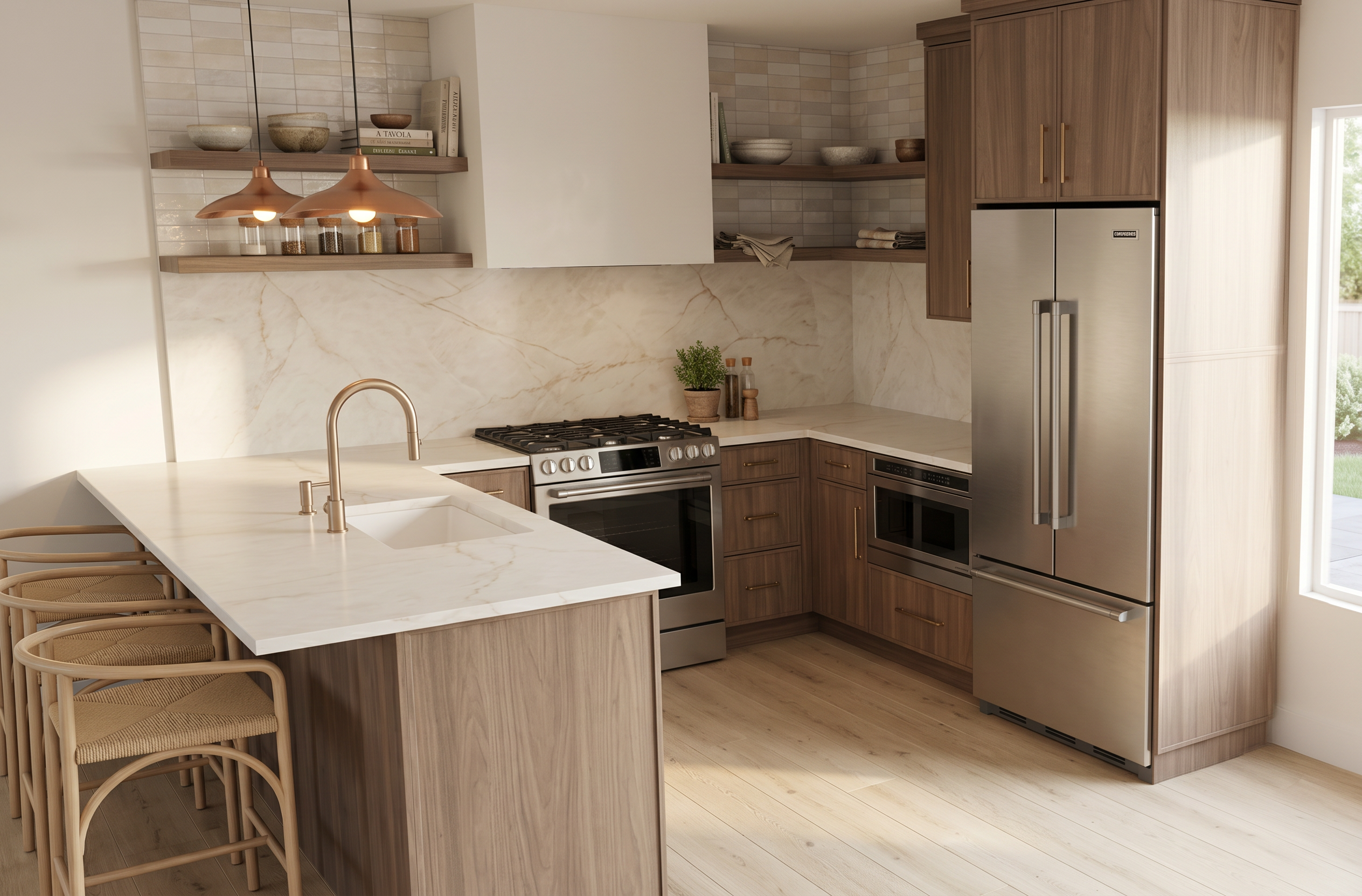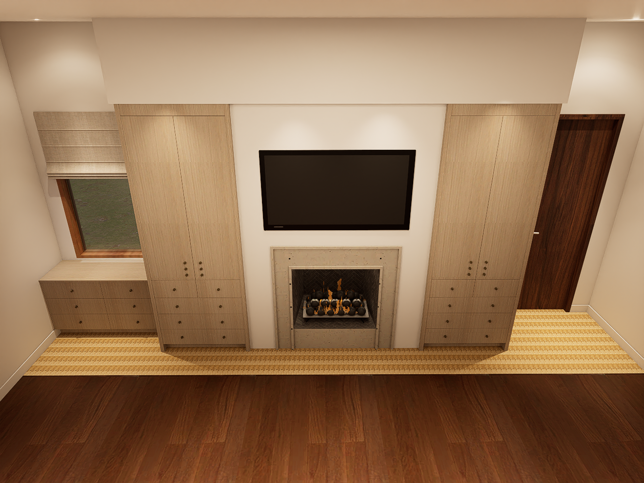 ultra realistic interior rendering of a warm contemporary primary bedroom feature wall with a centered fireplace and custom millwork symmetrical composition with floor to ceiling rift sawn white oak in vanilla stain cabinetry flanking a plaster fireplace surround cabinetry features vertical grain soft matte finish minimal brass hardware and integrated drawers below a large flat screen tv is mounted above the fireplace perfectly aligned fireplace is finished in a cast concrete finish with subtle tonal variation surrounding a firebox filled with charcoal fire spheres interior firebox lining has a slate grey split herringbone texture flames are natural gas low and ambient to the left a built in window bench with matching white oak cabinetry sits beneath a window with a textured roman shade in a warm neutral fabric to the right a flush wood door in a darker walnut tone adds contrast flooring is wide plank walnut natural hardwood in a medium warm tone with visible grain and satin finish transition detail important where the cabinetry platform meets the wood flooring include a refined tile inlay strip using cl zellige baguette tile gloss finish with 24k gold glaze dimensions 2 x 6 x 3 4 laid in a vertical pattern as a decorative threshold band tile should feel handcrafted with slight variation subtle reflectivity and imperfect edges catching light naturally lighting is soft indirect and architectural recessed ceiling lights with warm 2700k temperature gentle wall wash enhancing plaster texture subtle under cabinet shadowing for depth style should feel elevated editorial and timeless architectural digest aesthetic highly detailed materials realistic imperfections accurate light bounce soft shadows and natural color grading camera straight on elevation eye level 35 50mm lens rendering quality ultra realism ray traced lighting global illumination soft reflections micro texture detail