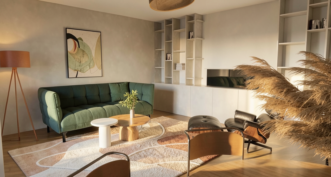 viste interne del soggiorno da varie angolazioni rispetta fedelmente la conformazione della planimetria la dimensione posizione di mobili e arredi i colori e materiali rispetta la disposizione delle aperture quali infissi esterni ed interni luce ombre morbide fotorealistico illuminazione cinematografica 8k non aggiungere elementi diversi da quelli presenti nella planimetria