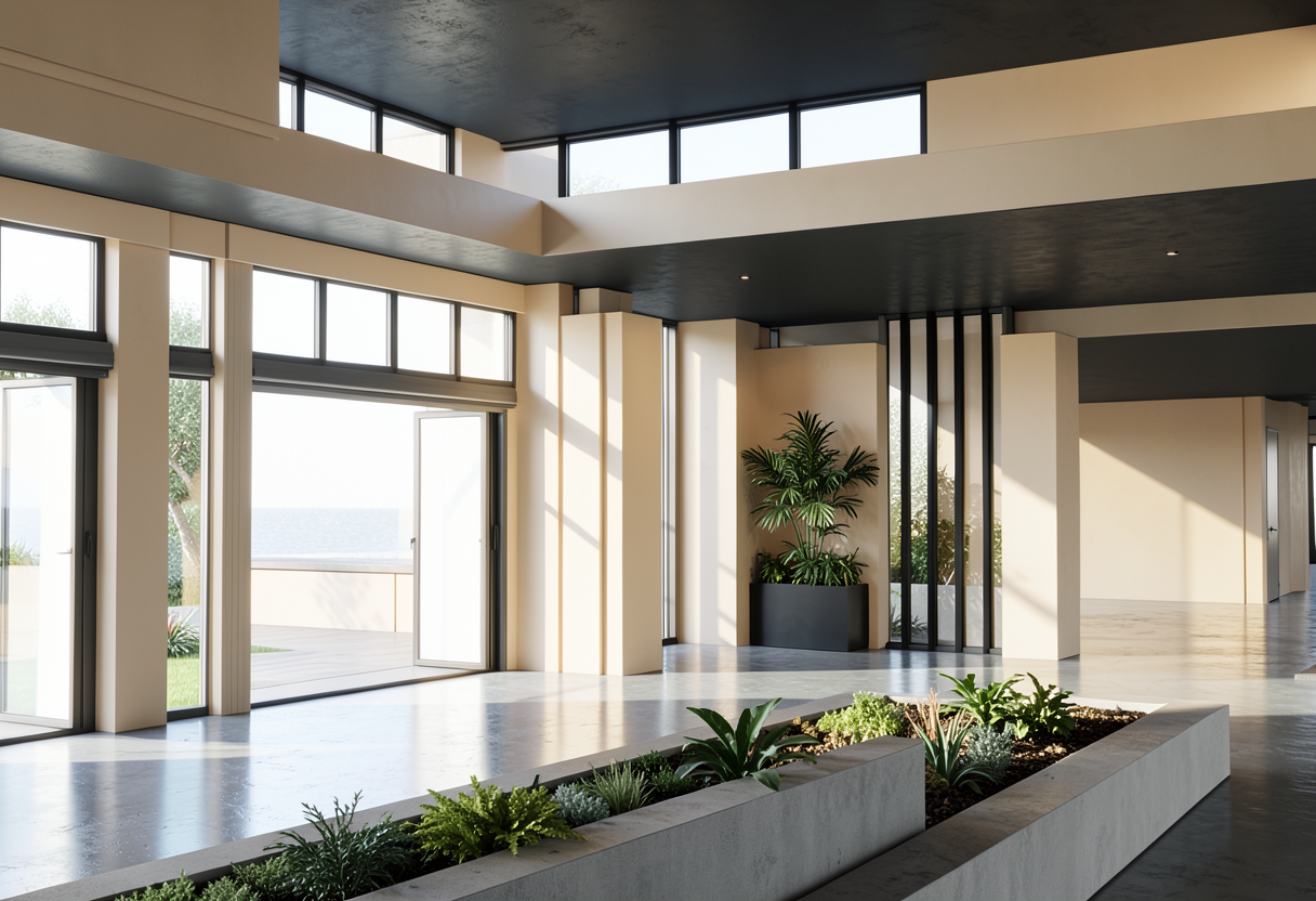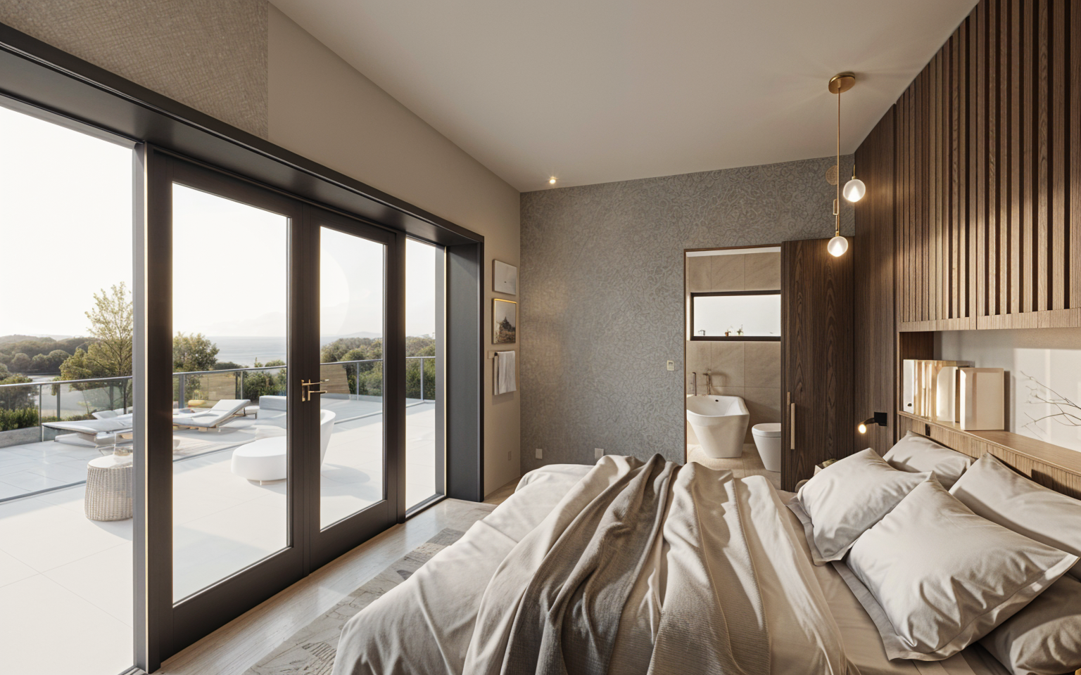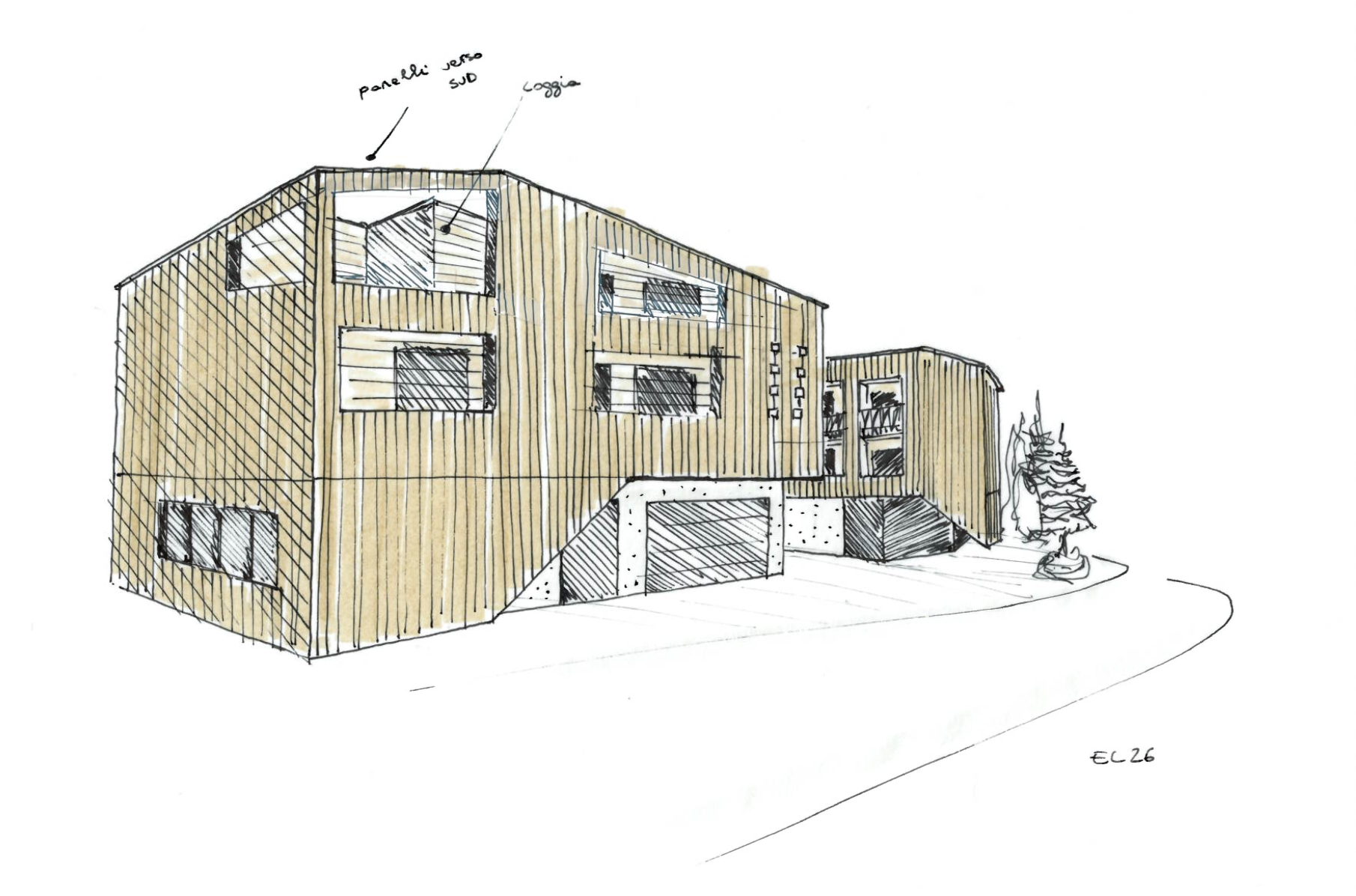 modern architectural design of two interlinked buildings with wooden facades set on uneven terrain render in a realistic style with soft natural lighting use light oak brown for the wooden panels and a muted concrete gray for the base structures include subtle grassy and rocky textures in the foreground blending into the environment set under a clear bright blue sky evoking a peaceful serene atmosphere add small detailed windows with reflections to enhance realism