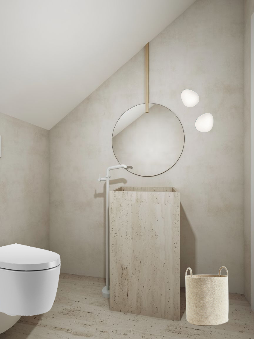 realistic high resolution render the wall has a off white light beige cemento effect there is a circular mirror above it a thin vertical wooden slat extends from the top of the mirror up to the ceiling adding a subtle architectural detail the overall atmosphere is calm minimal and refined with natural materials and a clean architectural aesthetic the celling is white show the porosity of the travertino in the sink the only light sources are the sconces the tap is white and comes from the floor the celling is white the basket on the right placed firectly on the floor