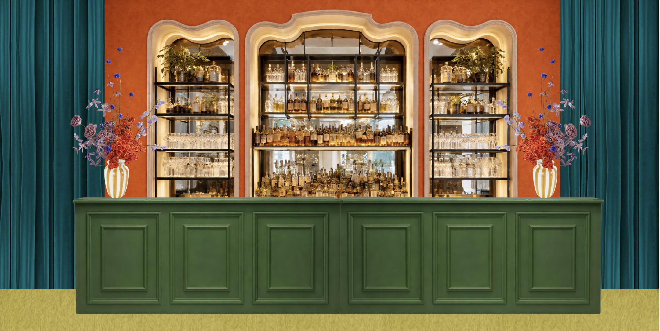 evening after party lighting green painted bar front chrome votive candles on the shelves mixed with clear glassware the shelving unit is painted orange have the shelves lit on the inside walls are teal velvet drape floor is yellow carpet