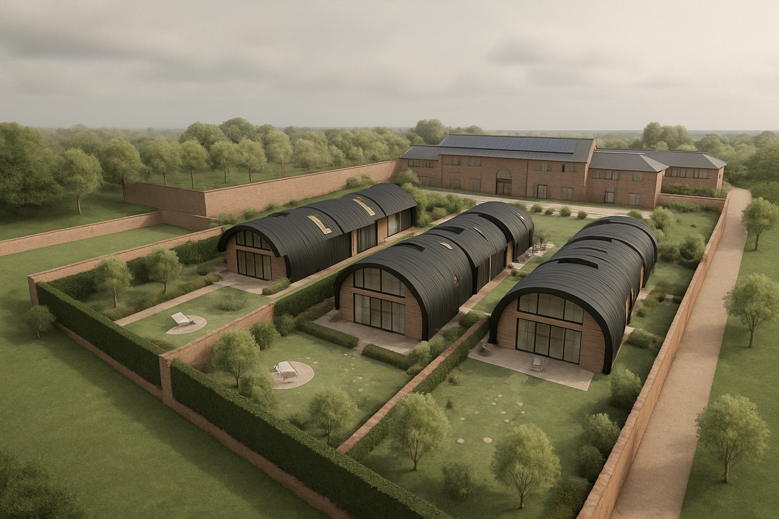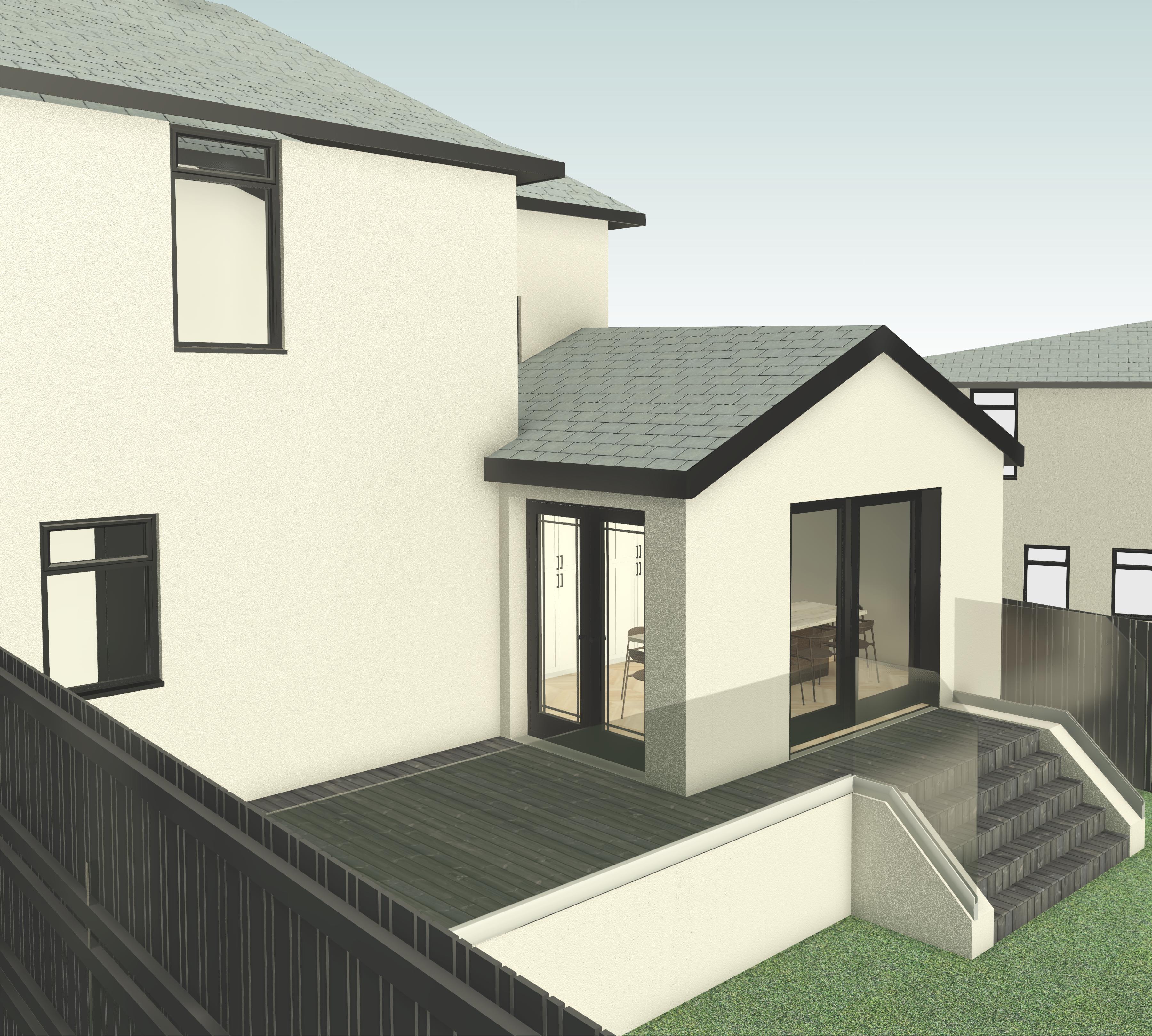 make grass and hedges realsistic make cream walls a render finsish add sky and trees in background notice glass balustrade on perimiter edge of deck