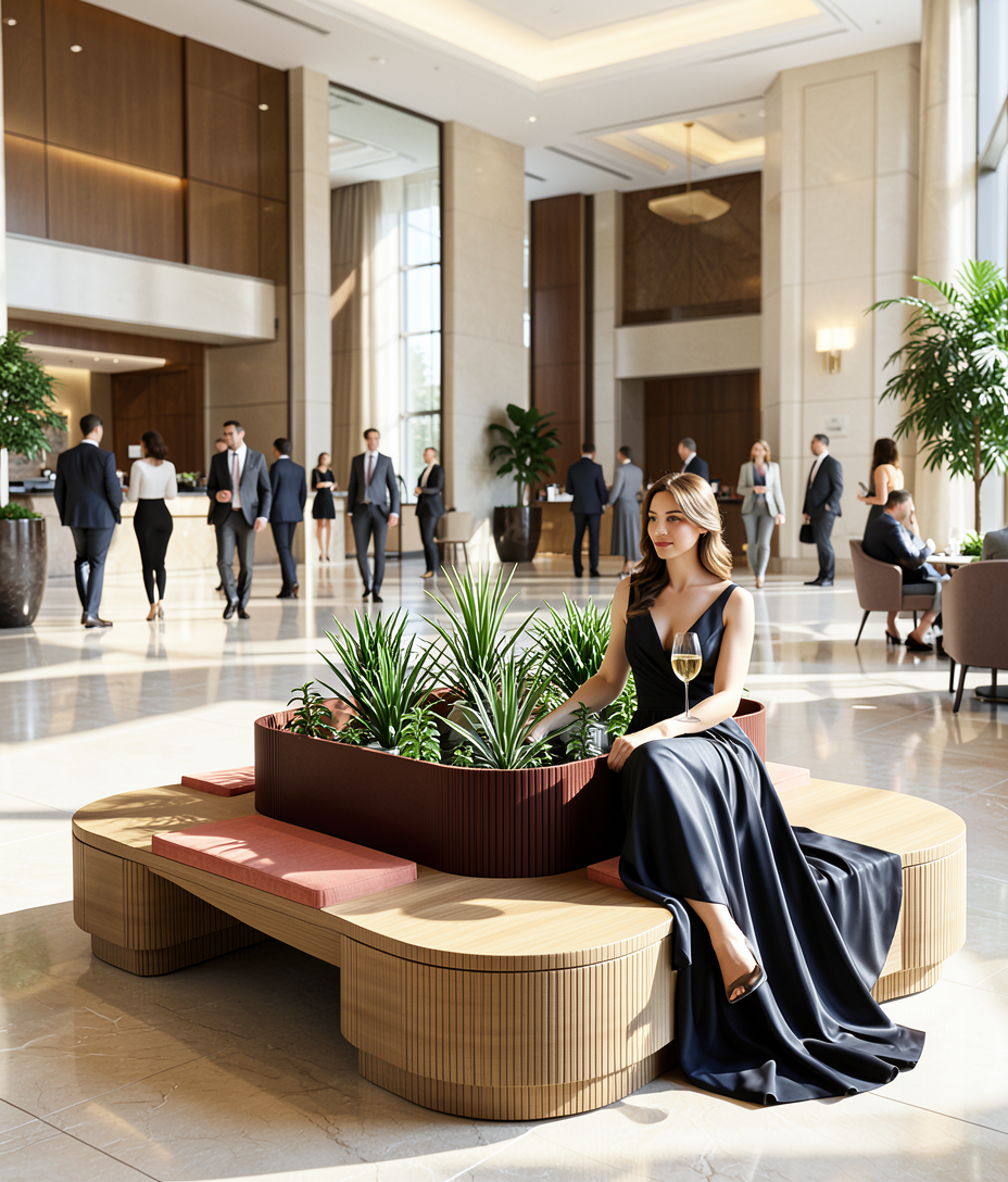 roof terracotta wavy terrace furniture modern cozy greenery around the house nice wather summer around 6pm breeze 2 people wander on the pavement reference photo for the brick pool 2kids playing in it in the garden flowers