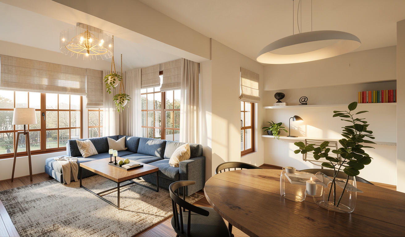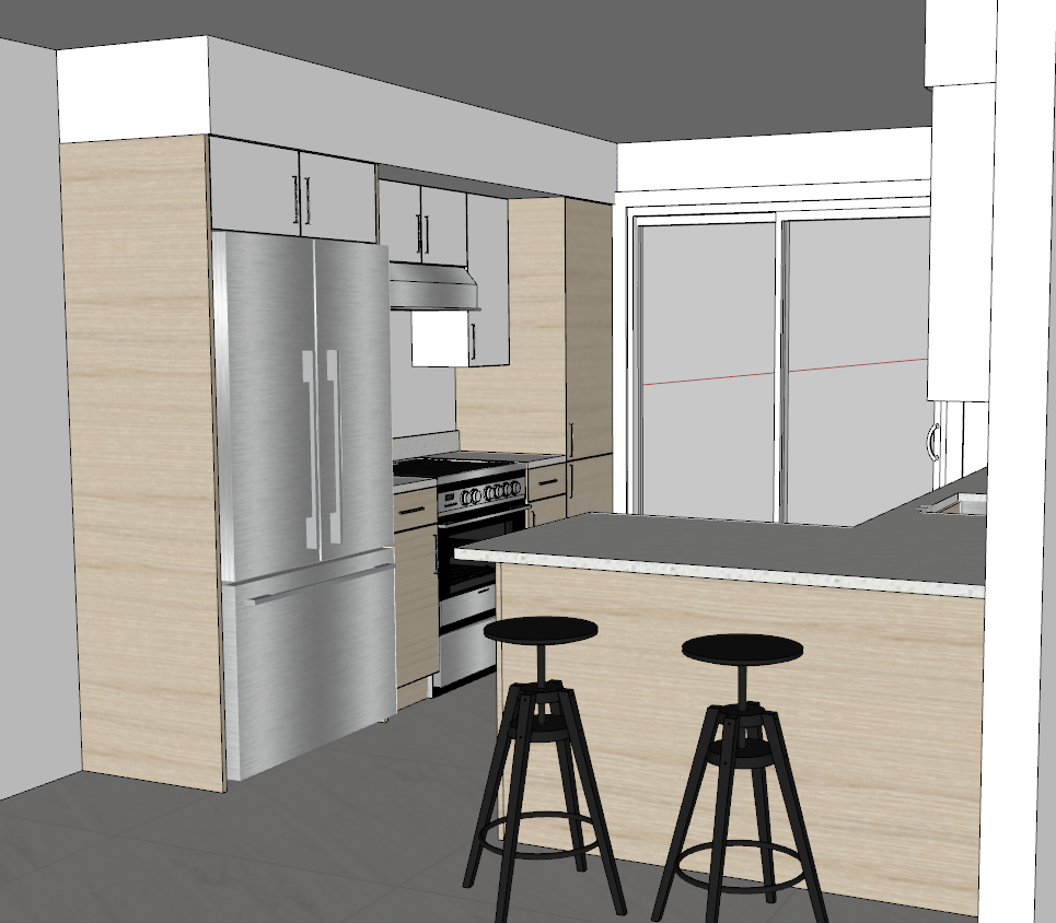 this kitchen has white cabinetry and light white oak cabinetry the floors are creamy white the walls and the ceilings are white got an exterior balcony because it s on a second floor apartment with a tree and clear skies counters are white