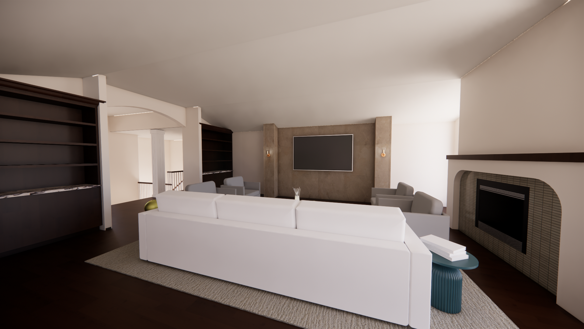 take the dark burgundy built in cabinets to the angled ceilng add some taupe leather accent chairs and linen sofa with a set of dark green accent swivel chairs and a potted olive tree in the corner to the right of the tv area
