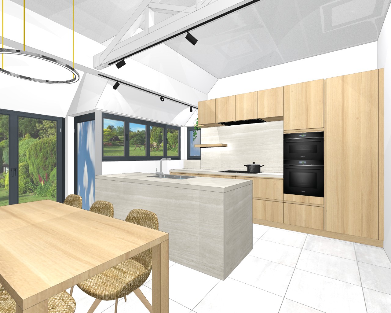 decorate eiland is one block table is in wood the same as the kitchen the wood is lighter wood the block where the sink is is also in stone as the tablet