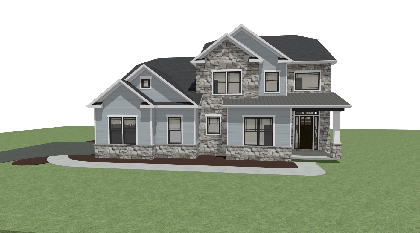 render this 3d image to appear photo realistic maintain all existing architectural materials and structural elements exactly as shown enhance the setting with a lush well maintained landscape include minimal beds manicured shrubs and a tree lined backdrop that frames the home naturally the windows should have a glossy finish with clear reflections of the surrounding trees and sky lighting should feel natural with soft shadows and realistic depth to bring the scene to life