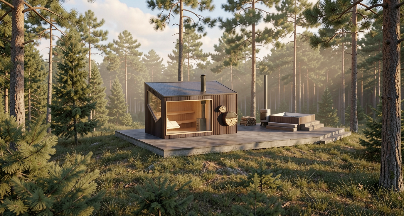 render a photorealistic 3d perspective of this sauna current material style keep model geometry the same windows doors roof dark bronze vertical board and batten siding surround with some pine trees no forest sky with light atmospheric depth render in hyper realistic architectural visualization quality 8k resolution