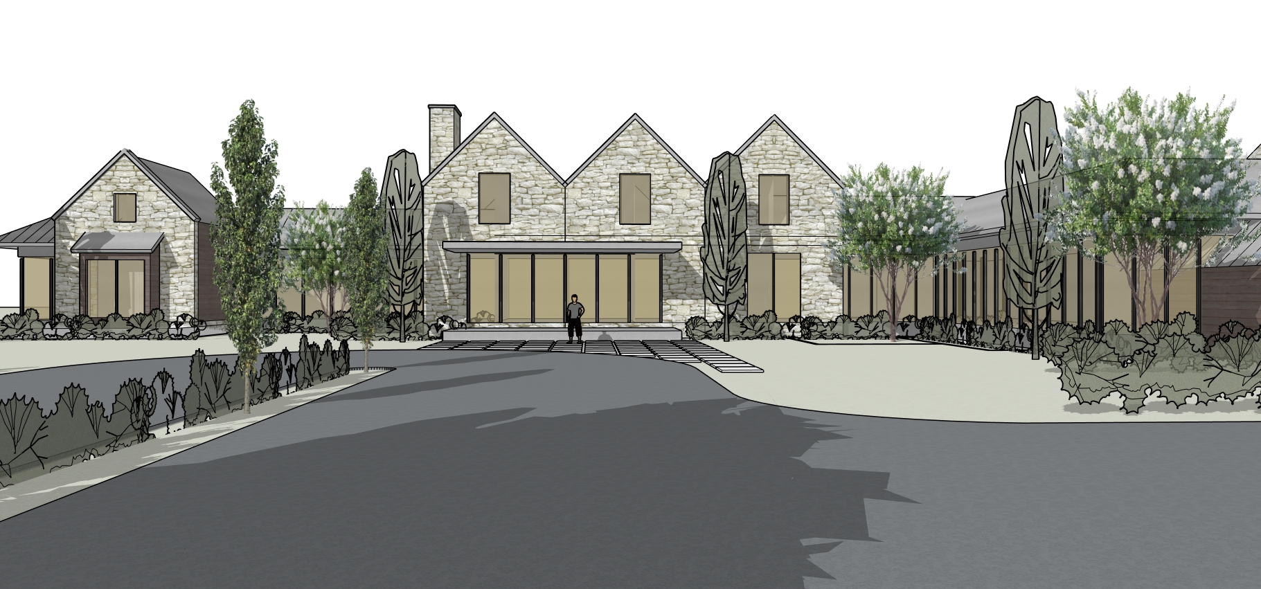 grainy watercolor render of timber frame building with reclaimed wood siding and stone wainscot watercolor trees and urban environment in the background extensive watercolor landscaping surrounding the building