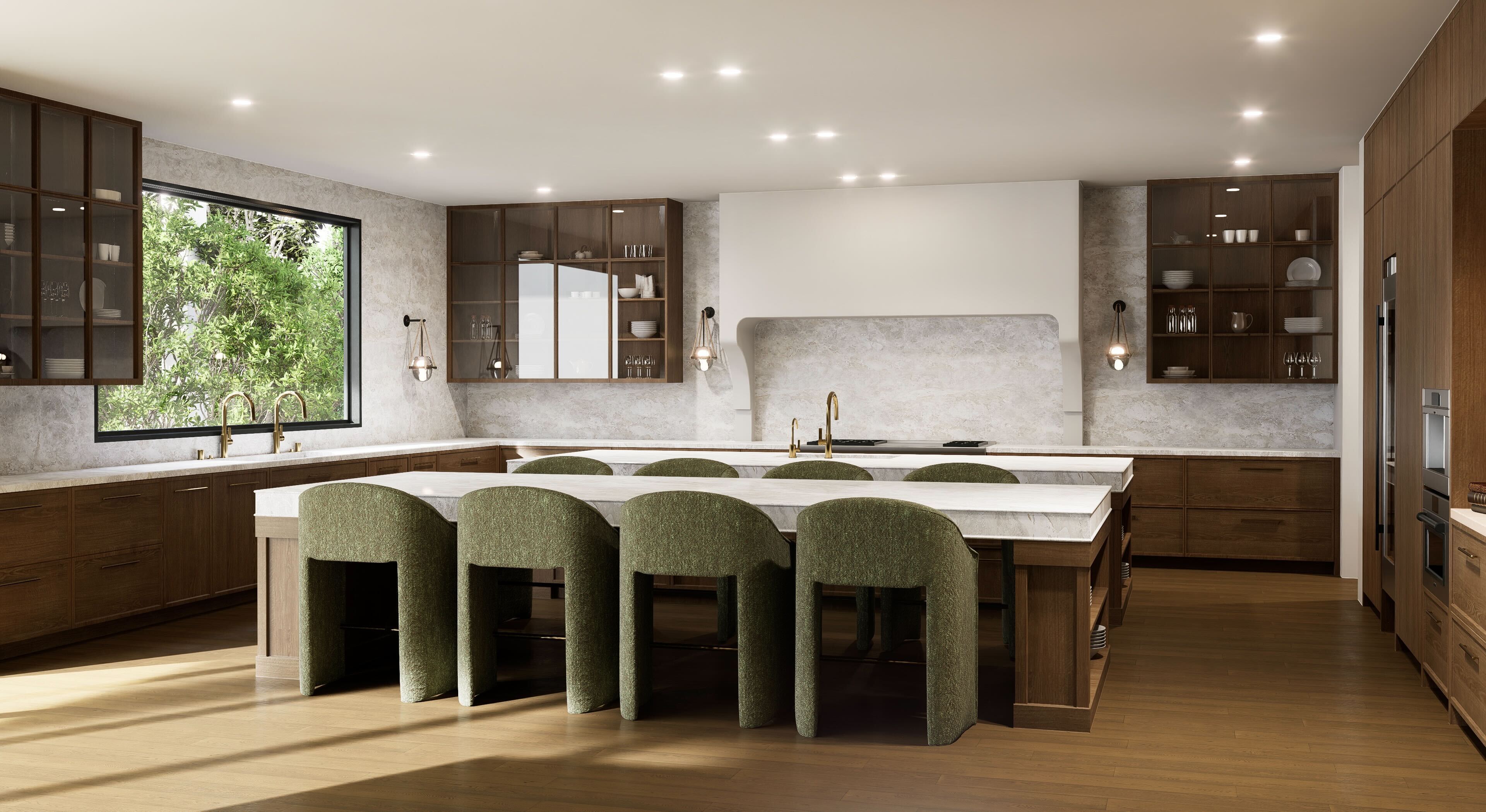 a photorealistic high end modern kitchen interior maintain the exact same layout cabinetry design island structure countertop material veining pattern and proportions as the original image do not change the countertop material or pattern only adjust the color tone of the existing slab to a warmer more beige hue the stone should shift from cooler gray tones to a soft warm beige cream tone while preserving all original veining texture and movement keep the same island and perimeter countertops but recolor them to feel warmer and more cohesive with the walnut cabinetry the finish remains honed update the bar stools to a new design chunky fully upholstered stools in a warm beige or taupe fabric with a sculptural and grounded form remove any green tones no thin metal legs change the range hood color to jh103 plaster a warm creamy beige with a matte chalky texture keep the same hood shape and rounded edges maintain all cabinetry lighting shelving and styling as is keep the walnut cabinetry tone unchanged the window remains open to a distant backyard view with soft greenery far away slightly blurred bringing in natural light overall look should feel warmer softer and more cohesive with a quiet luxury aesthetic no changes to layout or materials only color refinement and stool replacement