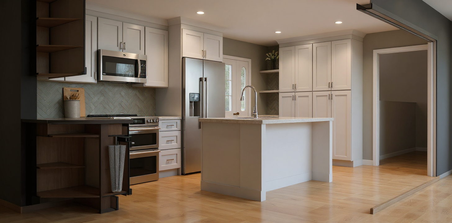 generate a beautiful suburban street scene featuring modern white houses with sleek roofs the atmosphere should be serene and inviting with a bright blue sky filled with soft fluffy clouds include lush green trees lining the street casting gentle shadows the road should be a rich smooth dark gray while the sidewalks are a clean light gray cars parked along the street should be in neutral colors like white or silver add warm natural sunlight to create a tranquil and welcoming neighborhood ambiance