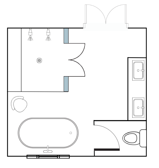 preserve the exact layout camera angle and placement of all elements do not move or redesign anything enhance the bathroom with realistic finishes light wood flooring full height tiled shower walls to the ceiling warm wooden vanities light colored quartz countertops subtle greige colored walls brushed nickel plumbing fixtures large mirrors over the sinks add soft subtle warm lighting