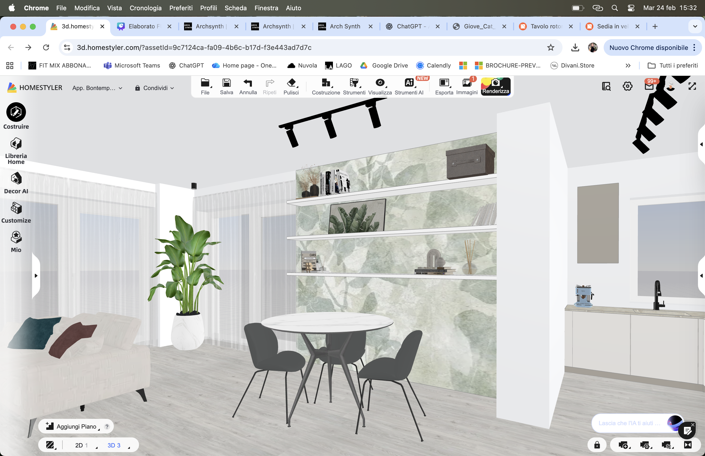 prompt sostituzione fitwall con carta da parati modify the existing scene without changing layout furniture proportions or camera angle replace only the current green vertical slatted wall fitwall behind the white floating shelves with the provided botanical wallpaper do not modify shelves position shelves thickness decorative objects table and chairs sofa plant kitchen lighting floor walls ceiling keep everything exactly as modeled wallpaper specifications apply a large scale botanical wallpaper with soft watercolor leaves in sage green tones on a light neutral background natural matte finish no texture depth flat wall surface not slatted subtle organic leaf pattern elegant soft contemporary seamless pattern application no visible repetition the wallpaper must cover the entire wall surface previously occupied by the green fitwall panels lighting maintain the same lighting conditions already set in the scene do not change exposure or camera do not add dramatic shadows photorealistic rendering high material realism architectural visualization style