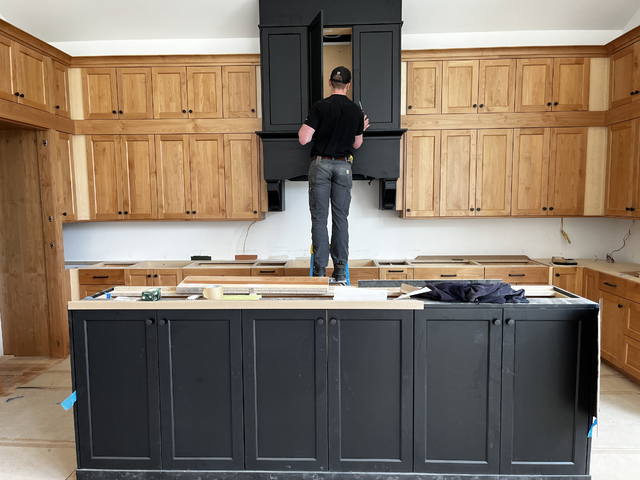 do not change the cabinets in any way preserve the exact cabinet colors materials finishes dimensions door and drawer styles hardware spacing alignment and all geometry exactly as shown do not alter the countertop shape backsplash appliances flooring lighting fixtures or wall structure only remove the construction materials clutter and mess from the scene clean the room and make it look finished and staged add a few simple tasteful home accessories appropriate for the style of the space but do not add or remove any furniture windows or architectural elements maintain the original lighting direction and realism enhance clarity and polish the photo while keeping the cabinetry and room design completely unchanged do not alter the lighting to keep the cabinet colors as they are in the image add white countertops stage for a kitchen make the upper fillers match the upper cabinets