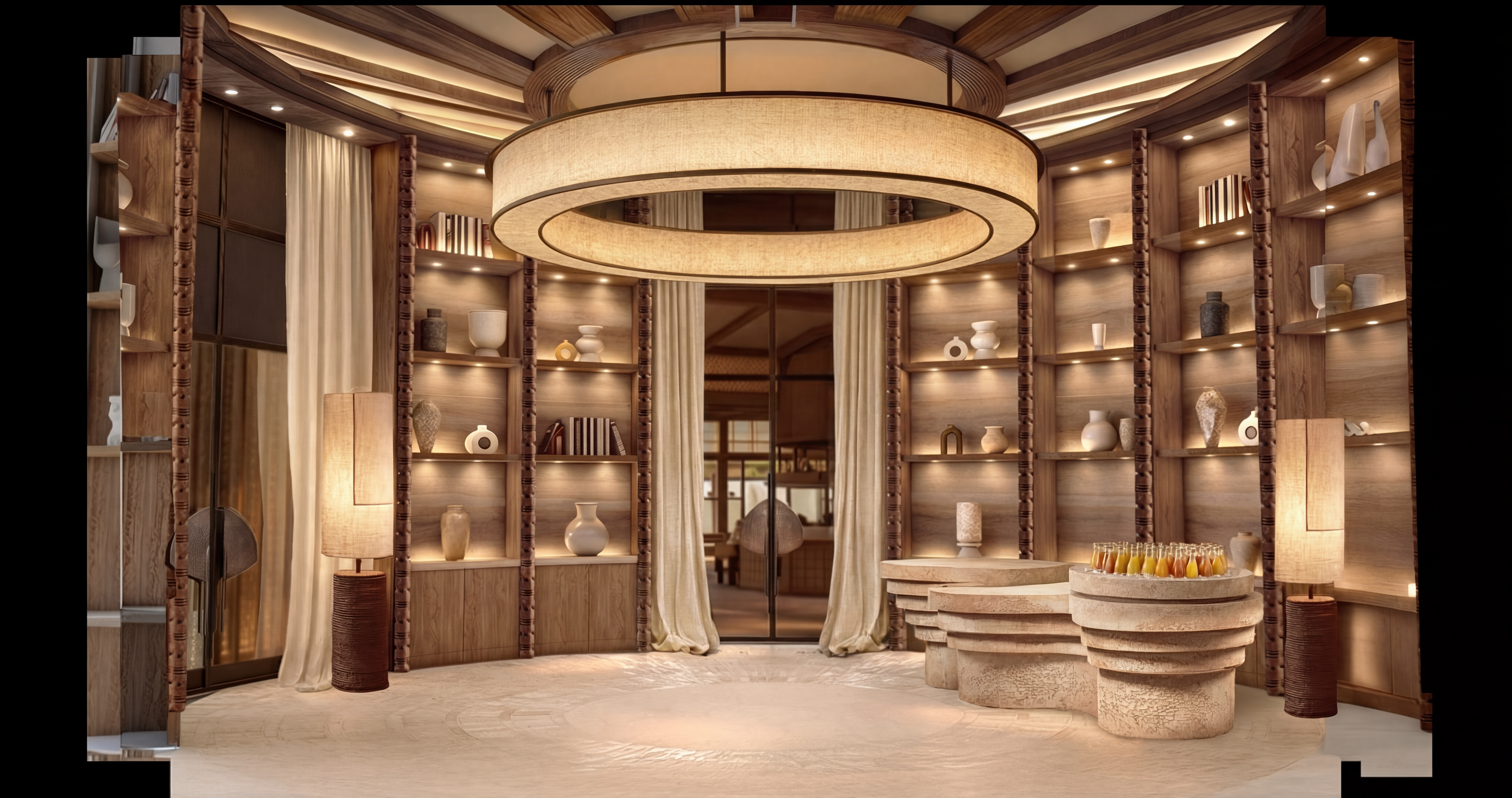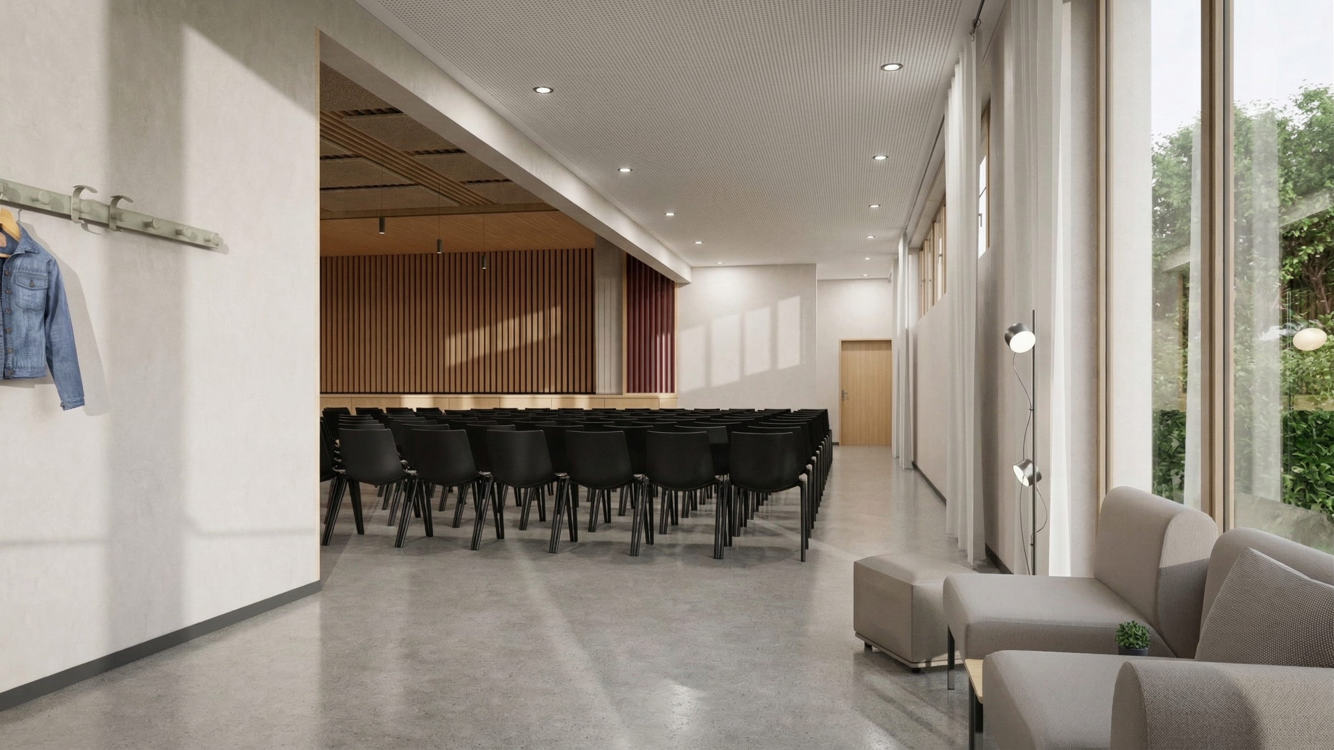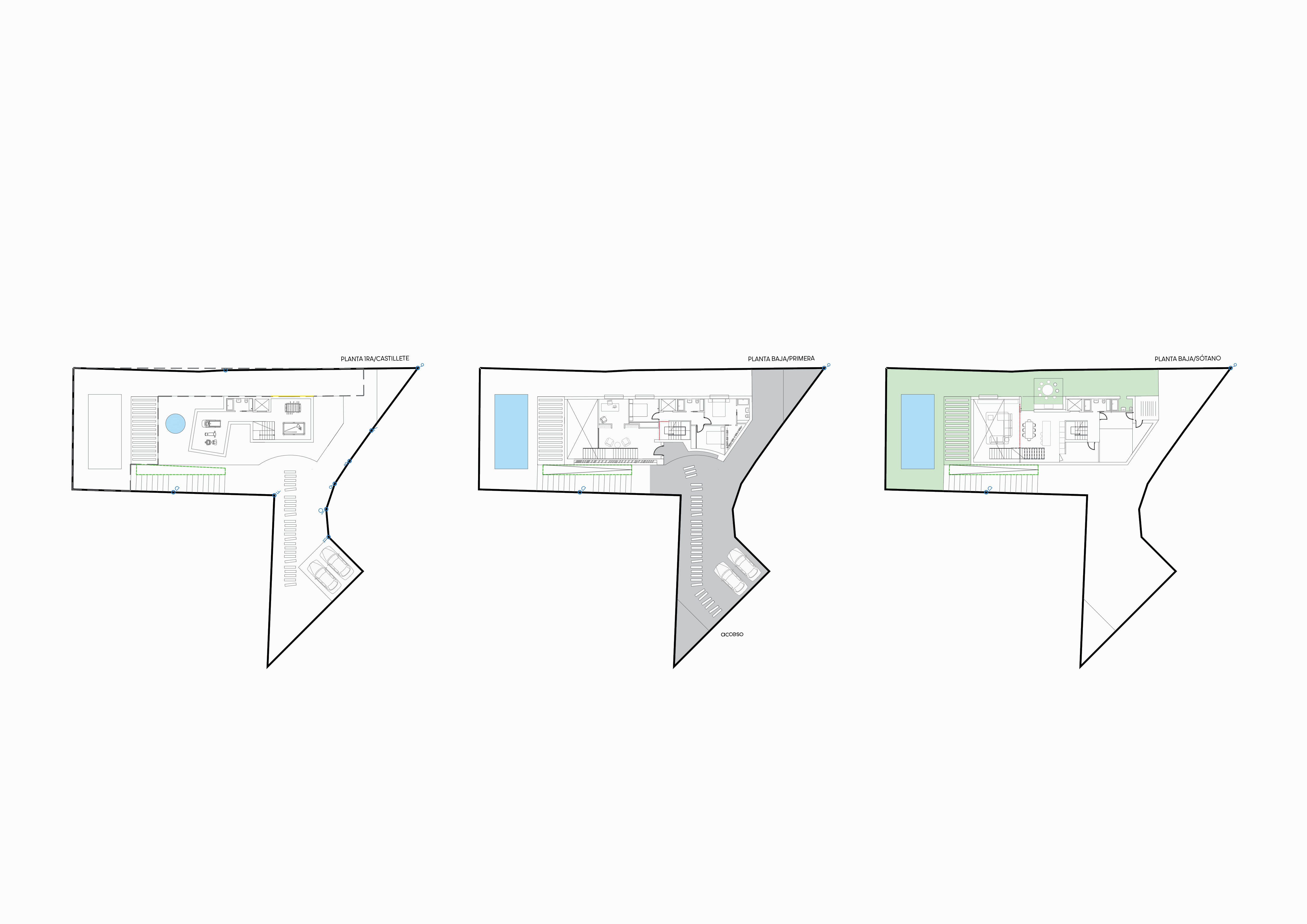render a detailed architectural floor plan with a modern minimalist design use a crisp white background for clarity emphasize the pool area with a vibrant turquoise blue the building outline should be a sleek black while interior elements are in soft gray tones highlight outdoor pathways with a subtle charcoal gray incorporate lush greenery around the perimeter with rich emerald and forest greens add warm sunlight casting soft natural shadows for a serene and inviting atmosphere