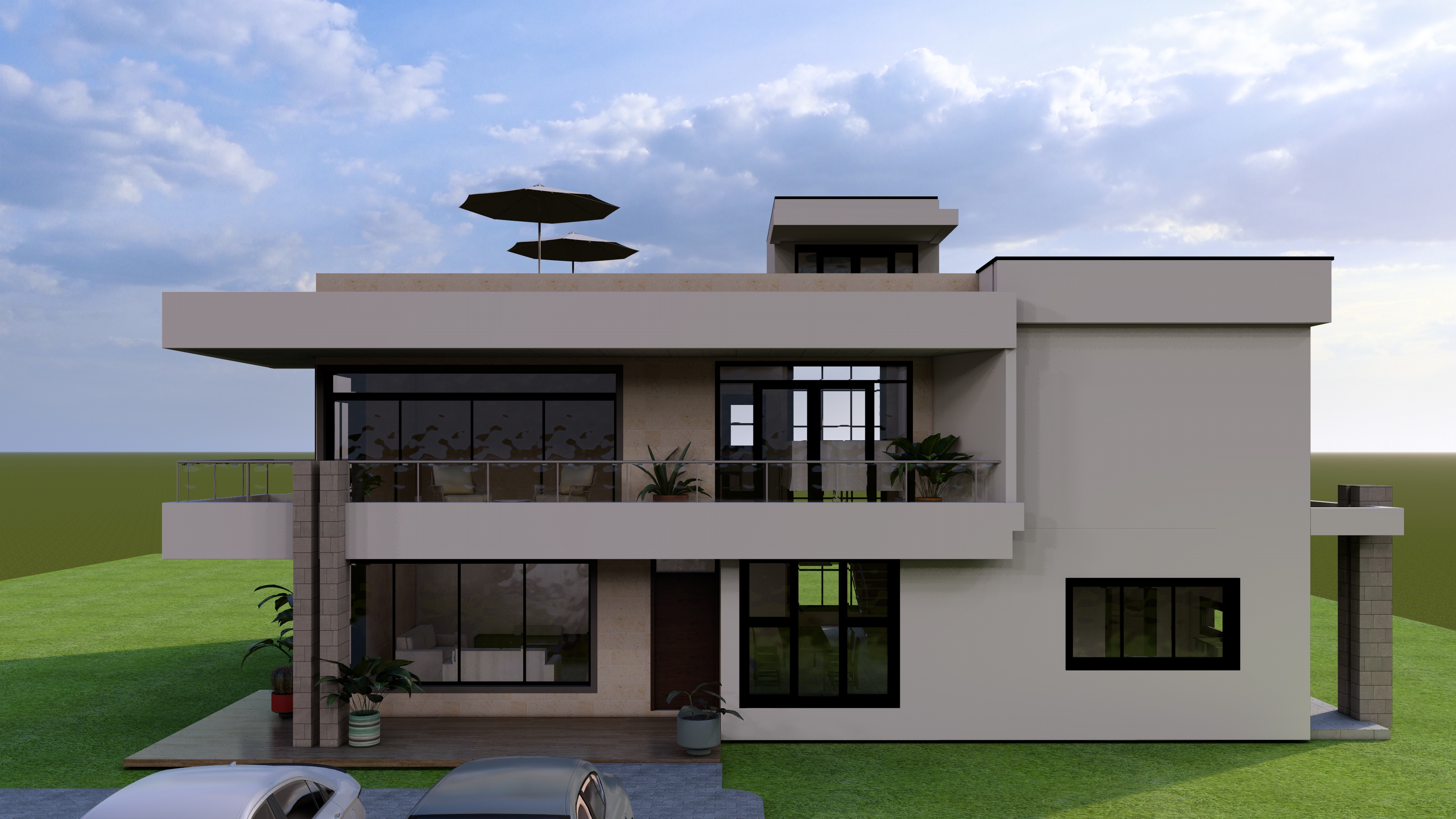 this is a model of a modern maisonette add few trees in background and neat vegetation to give it context add creamish interior warm lighting the walls with stone clad should be cladded with beidge machine cut stone finish white walls stay white