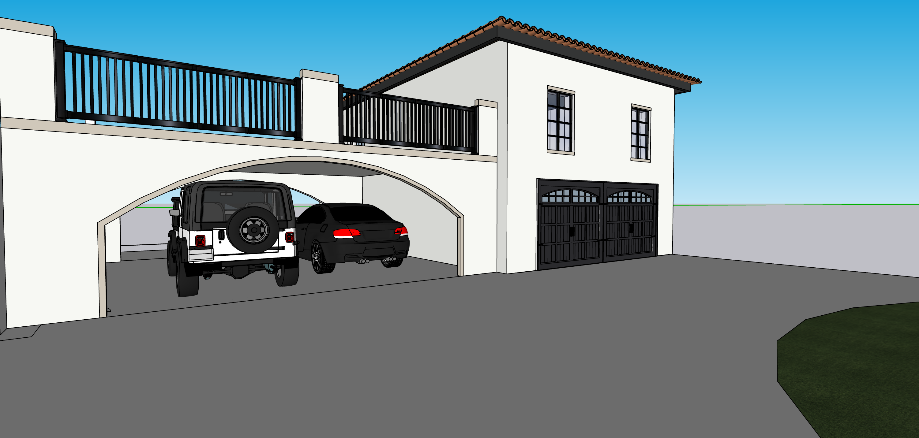 two cars parked under an elegant cream colored archway a white jeep with a spare tire and a sleek black sedan the atmosphere is modern and sophisticated the floor is smooth dark gray adding a sleek contrast above a rail with black metal bars stands out and on the side a two story white building with large dark framed windows and a pointed dark terracotta spanish tiled roof the sky is a clear vibrant blue creating a calm and inviting ambiance the garage doors are more modern and add a small gap between the two garage doors
