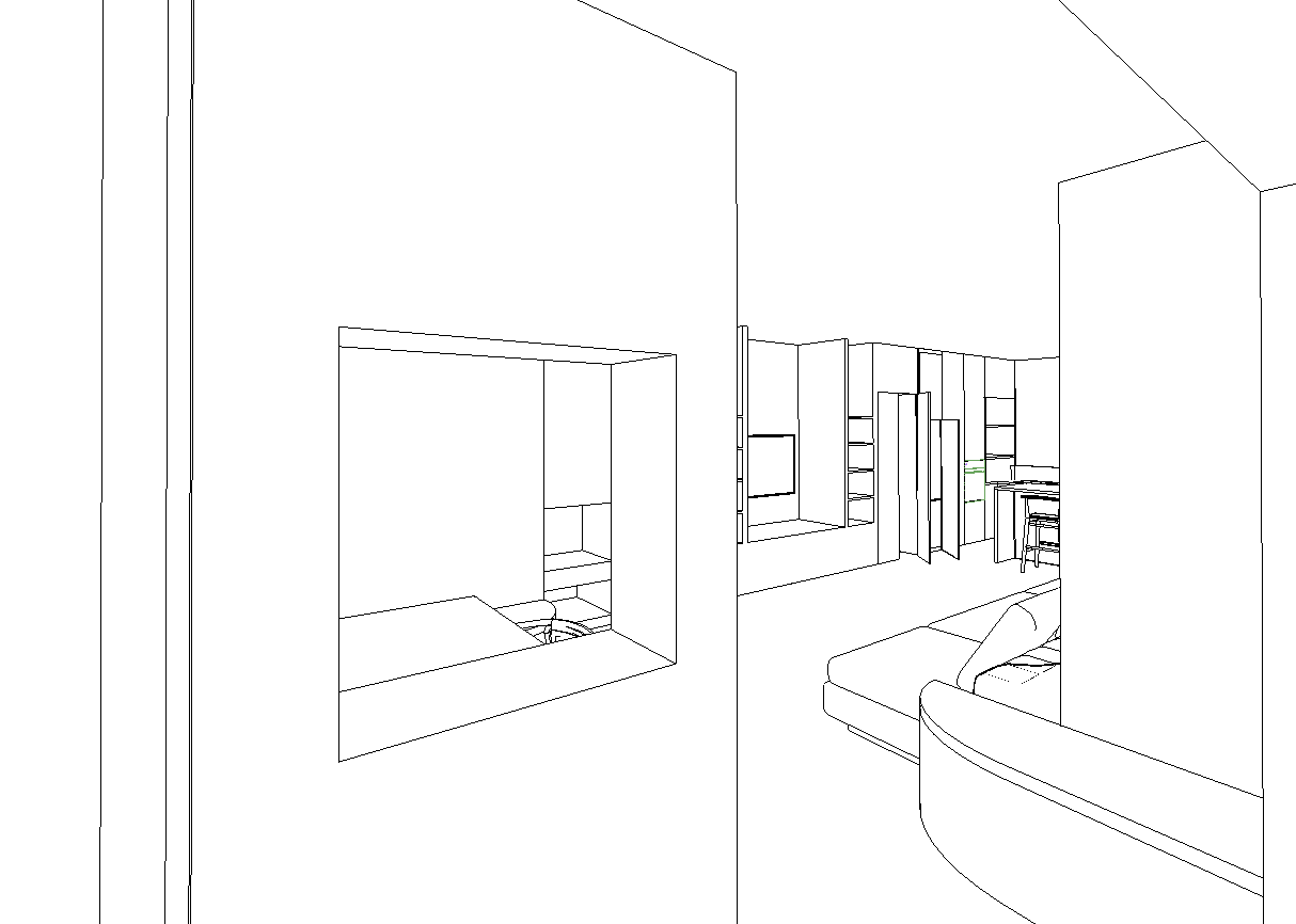 cinematic 3d interior render pov from a mountain house hallway looking through a geometric opening in a light white laminate entryway cabinet foreground a wooden entryway bench matching the parquet floor topped with a thick cushion in raw textured forest green fabric middle ground a matching wooden coffee table aligned with the bench background a cozy living room with a large sofa in melange brown and orange fabric left wall full height continuous wooden boiserie integrating tv unit open niches and cabinets wrapping onto the ceiling flooring wide plank rustic wood parquet right wall plain white natural alpine light high end mountain chalet interior design hyper realistic textures 8k