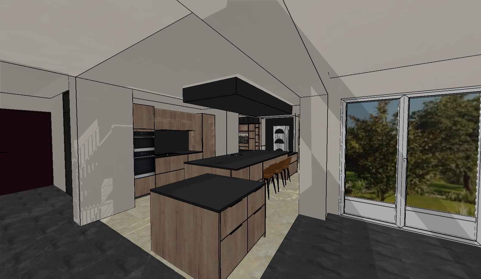 ajoute des spots sous le plafond noir mais garde une ambiance lumineuse de journ e le plan de travail est noir mat