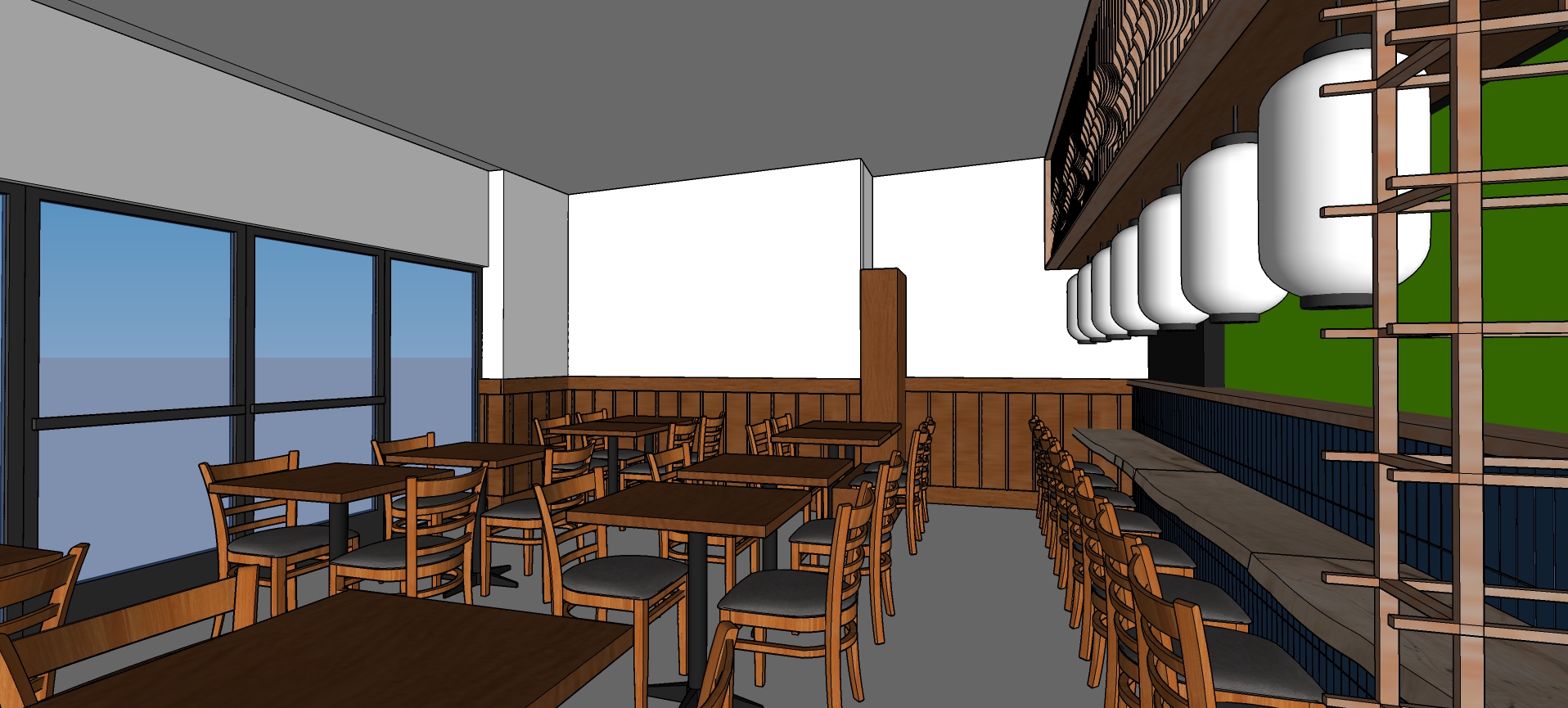 this is a tonkatsu izakaya all of the greenscreen in the back should be a bustling kitchen including the greenscreen on the right which passes through the dining area to the kitchen place traditional japanese plates and cups on the tables the lighting should be soft and warm evening time glow the lanterns should have japanese script on them staying in the theme of a tonkatsu izakaya place a small artwork on the wall on the left the double doors to the right should lead outside to dark nighttime the vertical lattice on the right of the lanterns should be rendered as wood