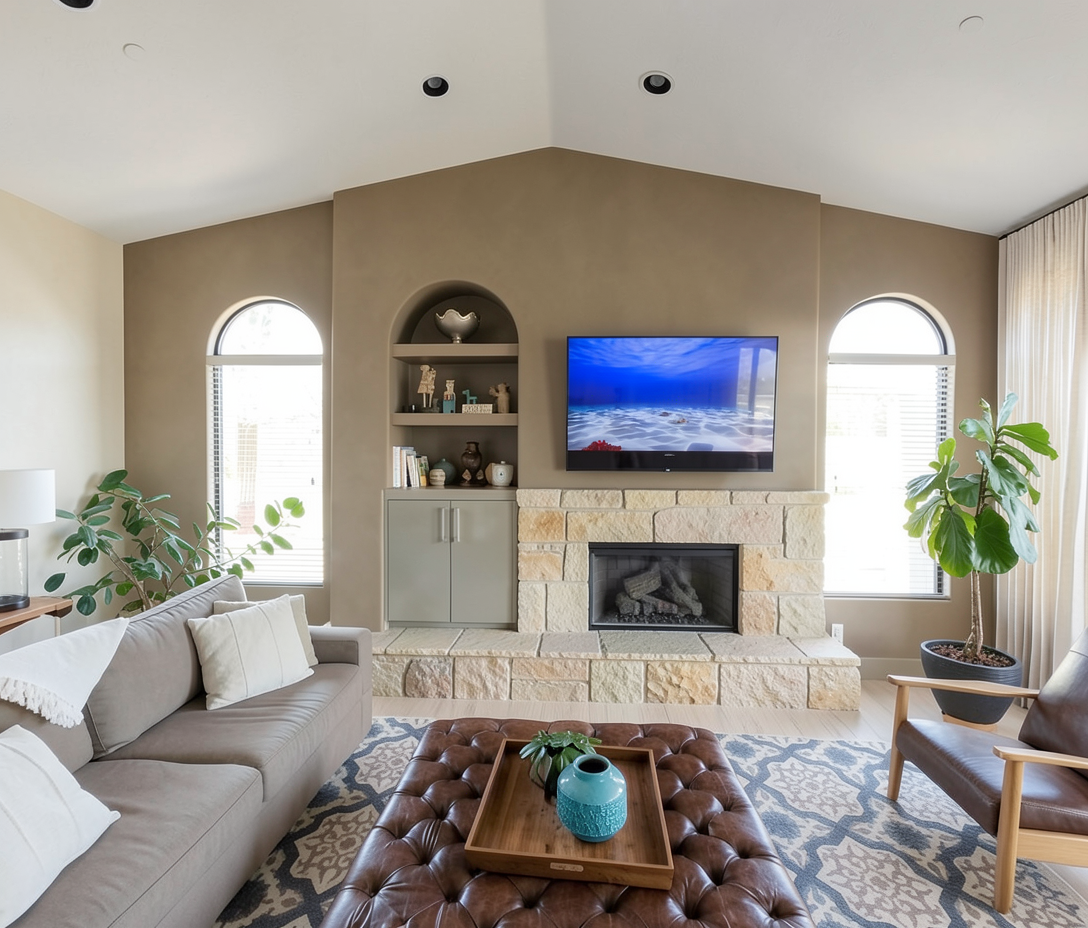genau dieses rendering berarbeiten fotorealistisches innenraum foto exakt dieselbe perspektive und kameraposition wie das hochgeladene referenzbild 100 identische raumgeometrie exakt gleiche m belanordnung exakt identische fensterpositionen mit gleichem ausblick durch die fenster weiches nat rliches tageslicht leicht schr g einfallende sonne durch die grossen fenster geschlossene r ume k nstlich ausleuchten sanfte realistische schatten blickrichtung ist nach osten sonnenlicht kommt von s den ersetze die m bel und teppiche mit modernen designerm bel ersetze den teppich mit dunkelbraunem eichenparkett moderne bilder an den w nden belebe die szene mit europ ischen menschen in alltagssituationen realistische materialien echte holztexturen stoff mit leichten gebrauchsspuren hochwertige oberfl chenreflexionen kleine gr npflanzen alle fenster mit hellbeigen transparenten vorh ngen nat rliche farbwiedergabe leicht warme farbstimmung golden hour feeling das bild muss wie eine professionelle fotografie aussehen es soll ein echtes und reales foto sein canon eos r5 35 mm festbrennweite f 2 8 hyperrealistisch dslr qualit t raw aufnahme 8k aufl sung extrem scharf perfekte tiefensch rfe professionelle architekturfotografie