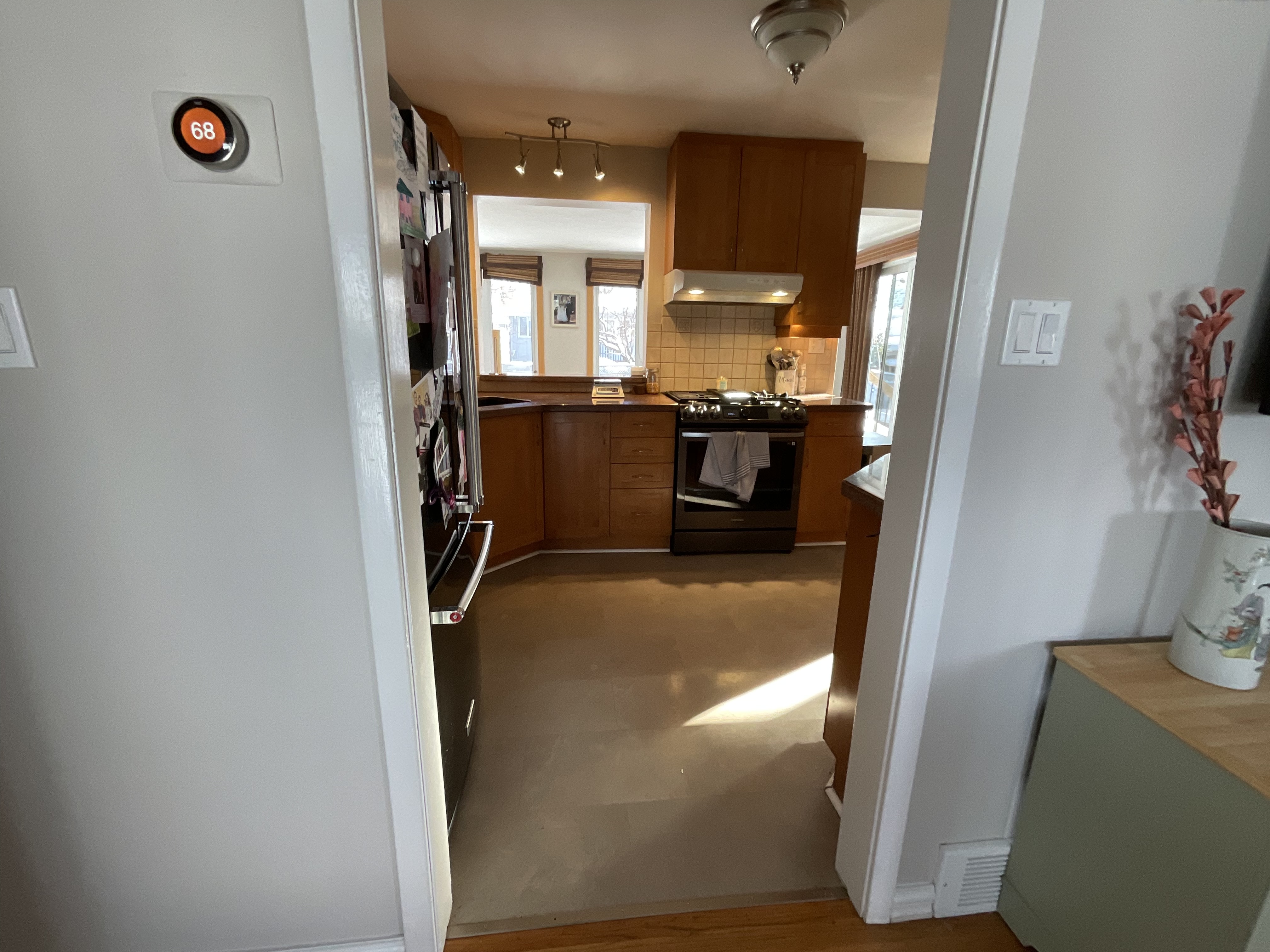 replace the floor tile by a light terrazzo replace the ceiling light fixtures by the light fixtures attached replace the backsplash with the arch tile attached in 6x6 inch format